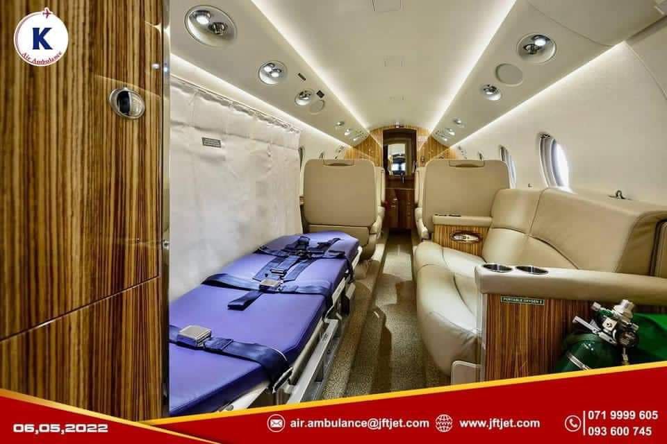 ក្រុមហ៊ុន JFT JET គ្រោងនឹងដាក់ដំណើរការ K- Air Ambulance ដែលជាសេវាយន្តហោះឯកជន លំដាប់ VIP សម្រាប់បញ្ជូនអ្នកជំងឺទៅព្យាបាលនៅមន្ទីរពេទ្យក្រៅប្រទេស នឹងបើកដំណើរការចាប់ពីថ្ងៃទី១ មិថុនា នេះទៅហើយ។ នេះបើតាមការឲ្យដឹងពីតំណាងក្រុមហ៊ុន JFT JET លោកស្រី ខែក ខេមរ៉ាត កាលពីថ្ងៃទី១ ខែមិថុនា ឆ្នាំ២០២២។