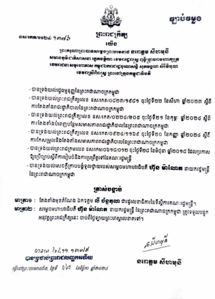 ព្រះករុណា ព្រះបាទសម្តេច ព្រះបរមនាថ នរោត្តម សីហមុនី ព្រះមហាក្សត្រនៃកម្ពុជា បានចេញព្រះរាជក្រឹត្យត្រាស់បង្គាប់តែងតាំងមុខតំណែង និងផ្តល់ឋានៈ លោក លី ច័ន្ទតុលា ជាអគ្គលេខាធិការ នៃអគ្គលេខាធិការដ្ឋានគណៈកម្មាធិការដឹកនាំការកែទម្រង់ច្បាប់ មានឋានៈស្មើទេសរដ្ឋមន្ត្រី នៅថ្ងៃទី២៤ ខែធ្នូ ឆ្នាំ២០២៤។