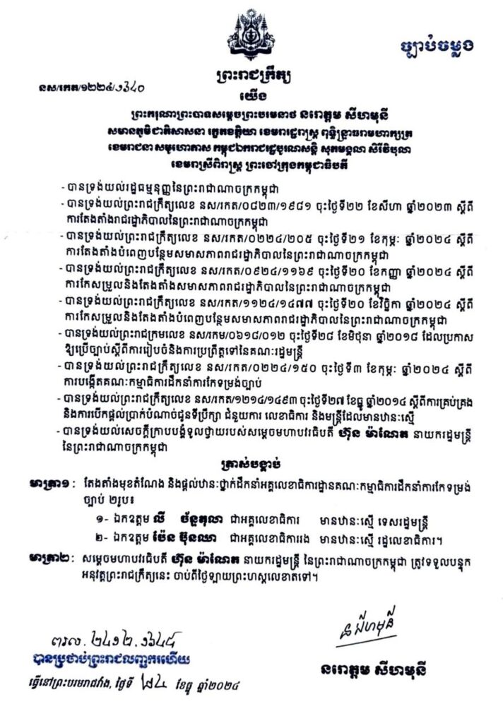 ក្នុងព្រះរាជក្រឹត្យជាមួយគ្នានេះដែរ ព្រះមហាក្សត្រក៏បានត្រាស់បង្គាប់តែងតាំង លោក ប៉ែន ប៊ុនឈា ជាអគ្គលេខាធិការរង មានឋានៈស្មើរដ្ឋលេខាធិការ។
