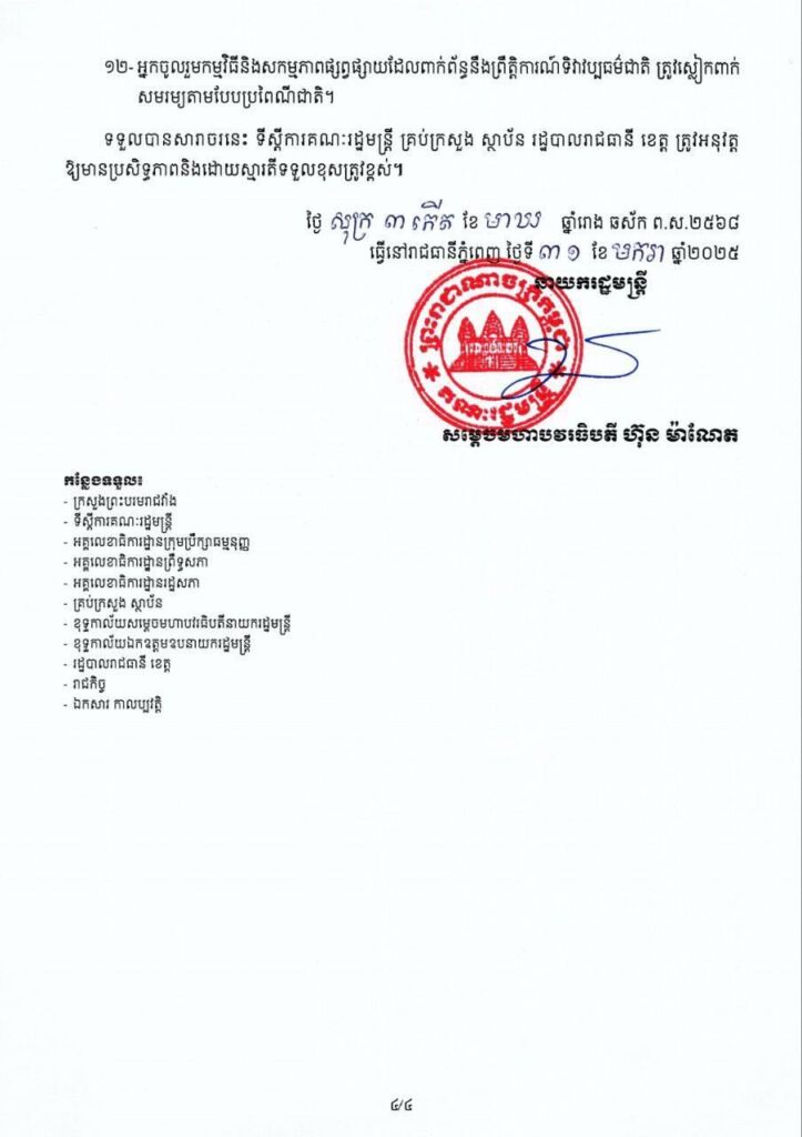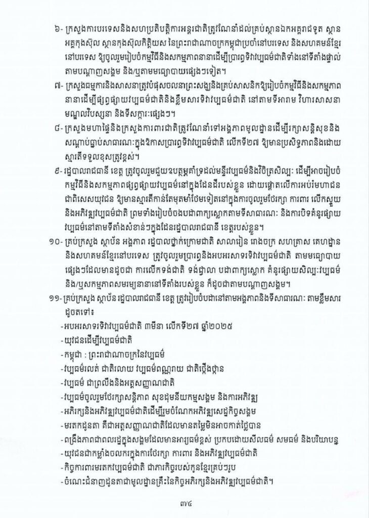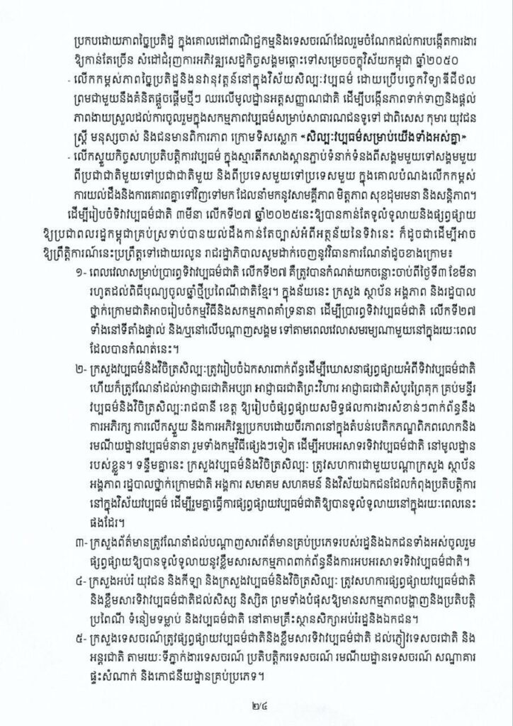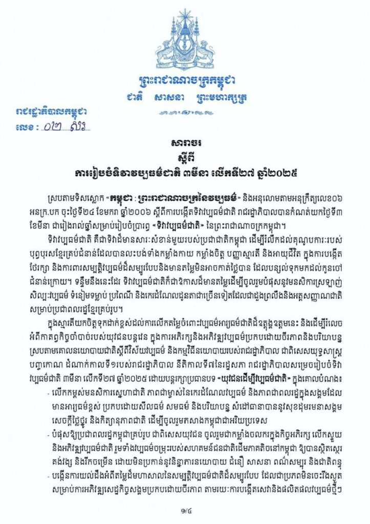 ការជំរុញរបស់សម្តេចធិបតី ហ៊ុន ម៉ាណែត តាមរយៈសារាចរស្តីពី ការរៀបចំទិវាវប្បធម៌ជាតិ ៣មីនា លើកទី២៧ ឆ្នាំ២០២៥ ដែលផ្សាយចេញនៅថ្ងៃទី ០៣ ខែកុម្ភៈ ឆ្នាំ២០២៥។