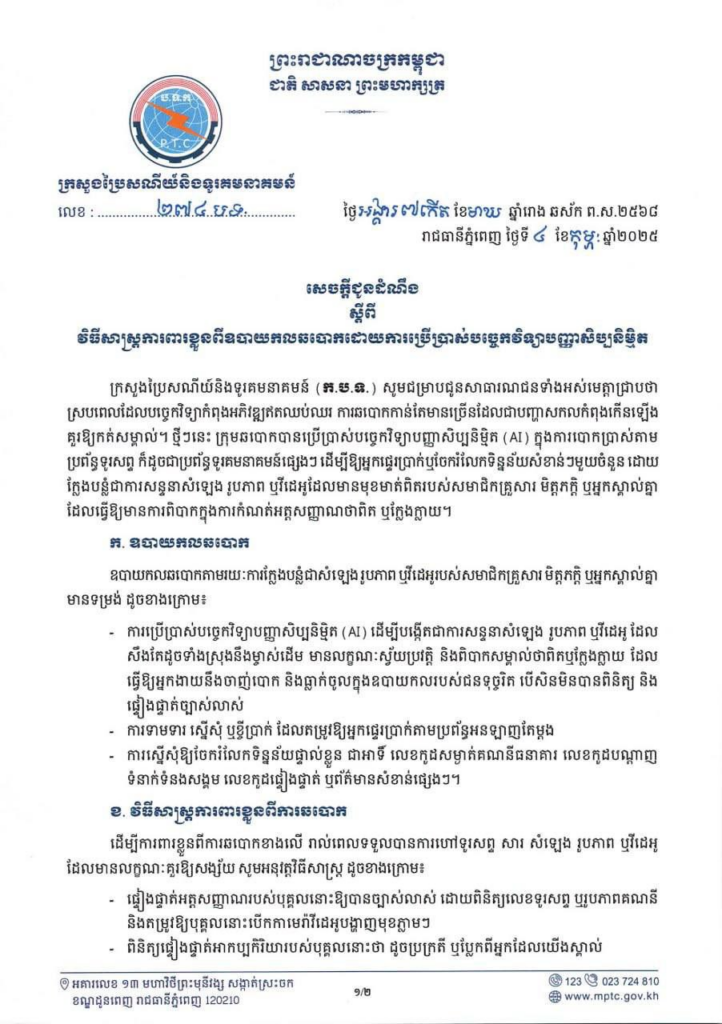 ក្រសួងប្រៃសណីយ៍និងទូរគមនាគមន៍ (ក.ប.ទ.) បានជូនដំណឹងពីវិធីសាស្ត្រការពារខ្លួនពីឧបាយកលឆបោកដោយការប្រើប្រាស់បច្ចេកវិទ្យាបញ្ញាសិប្បនិម្មិត(AI) ក្នុងការបោកប្រាស់ តាមប្រព័ន្ធទូរសព្ទ ក៏ដូចជាប្រព័ន្ធទូរគមនាគមន៍ផ្សេងៗ។