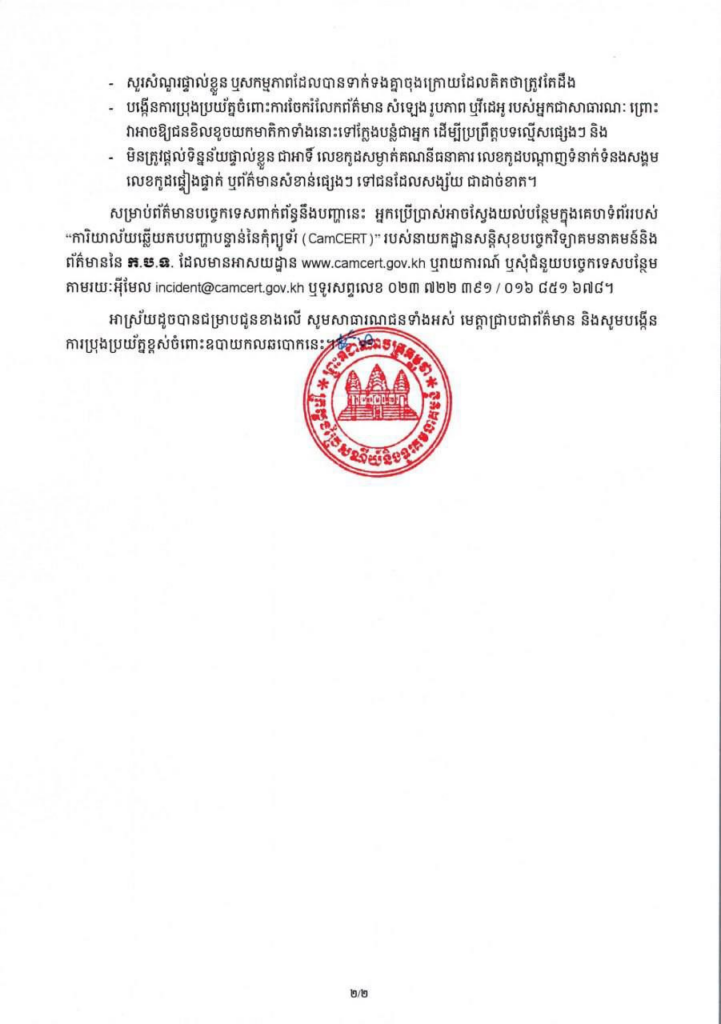 ៤,មិនត្រូវផ្ដល់ទិន្នន័យផ្ទាល់ខ្លួន ជាអាទិ៍ លេខកូដសម្ងាត់គណនីធនាគារ លេខកូដបណ្តាញទំនាក់ទំនងសង្គម លេខកូដផ្ទៀងផ្ទាត់ ឬព័ត៌មានសំខាន់ផ្សេងៗ ទៅជនដែលសង្ស័យ ជាដាច់ខាត៕