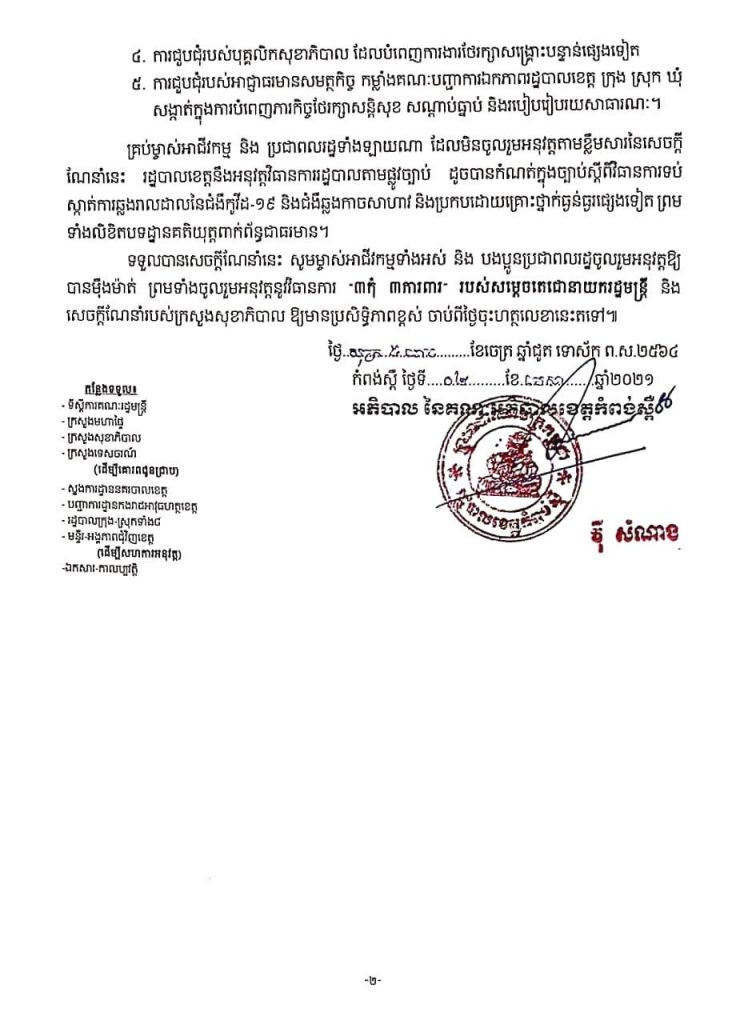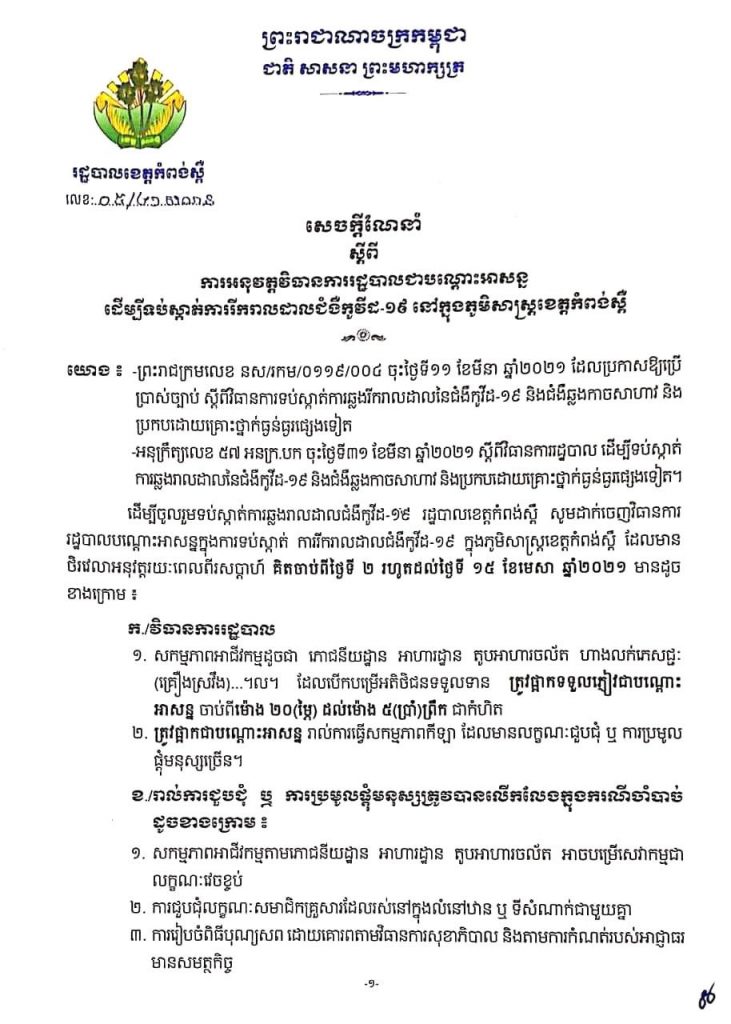 អភិបាលខេត្តកំពង់ស្ពឺ លោក វ៉ី សំណាង បានសម្រេចដាក់ចេញវិធានការរដ្ឋបាលផ្អាកការជួបជុំ ផ្អាកសកម្មភាពអាជីវកម្មដូចជា ភោជនីយដ្ឋាន អាហារដ្ឋាន តូបអាហារចល័ត ហាងលក់ភេសជ្ជៈ (គ្រឿងស្រវឹង) ដែលបើកបម្រើអតិថិជន ត្រូវផ្អាកទទួលភ្ញៀវជាបណ្ដោះអាសន្ន ចាប់ពីម៉ោង៨យប់ ដល់ម៉ោង៥ភ្លឺ។