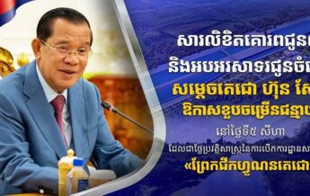 អ្នកឧកញ៉ាបណ្ឌិត សំ សុខនឿន ផ្ញើសារលិខិតគោរពជូនពរ និងអបអរសាទរជូនចំពោះសម្តេចតេជោ ហ៊ុន សែន ក្នុងឱកាសខួបចម្រើនជន្មាយុនៅថ្ងៃទី៥ សីហា ដែលជាថ្ងៃប្រវត្តិសាស្ត្រនៃការបើកការដ្ឋានសាងសង់ «ព្រែកជីកហ្វូណនតេជោ»