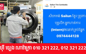 ឱកាសមកដល់ហើយសម្រាប់ប្អូនៗ សិស្សនិស្សិត! ក្រុមហ៊ុនផលិតសំបកកង់ Sailun ខ្មែរ កំពុងជ្រើសរើសបុគ្គលិក អ្នកហាត់ការ (Intern) គ្រប់ផ្នែកចំនួន ២០ នាក់