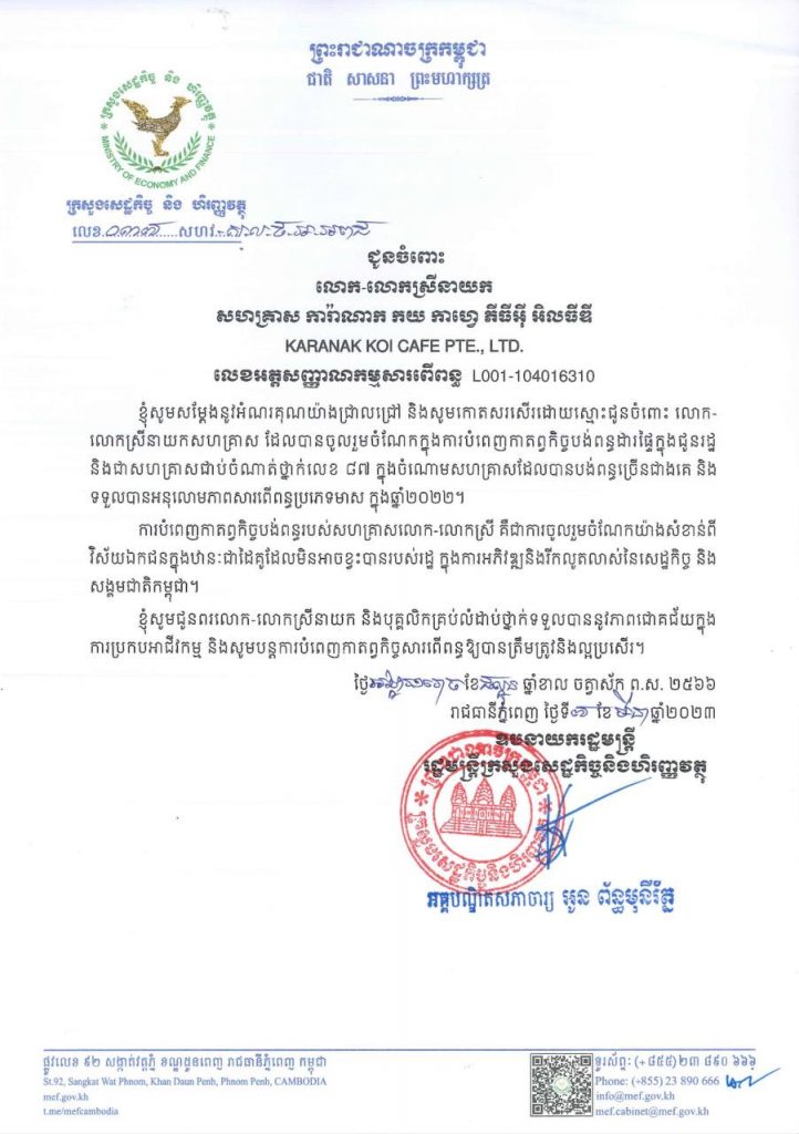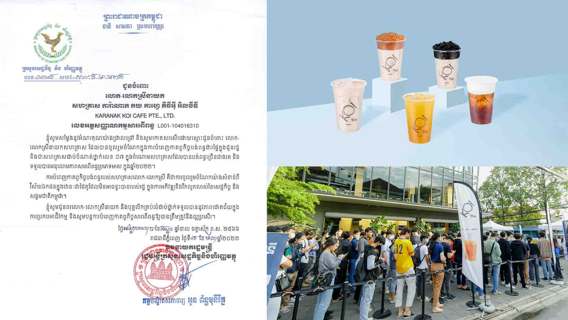 ខយ តេ កម្ពុជា (KOI Thé Cambodia) បានទទួល វិញ្ញាបនបត្រអនុលោមភាពសារពើពន្ធប្រភេទ មាស ពីអគ្គនាយកដ្ឋានពន្ធដារ ហើយបានជាប់ចំណាត់ថ្នាក់លេខ ៨៧ ក្នុងចំណោមសហគ្រាសដែលបាន បង់ពន្ធច្រើនជាងគេប្រចាំឆ្នាំ ២០២២។ ទូទាំងប្រទេស មានតែសហគ្រាស ២០០ ប៉ុណ្ណោះដែលត្រូវបានជ្រើសរើសដោយអគ្គនាយកដ្ឋានពន្ធដារ សម្រាប់វិញ្ញាបនបត្រអនុលោមភាពសារពើពន្ធប្រភេទមាសនេះ។