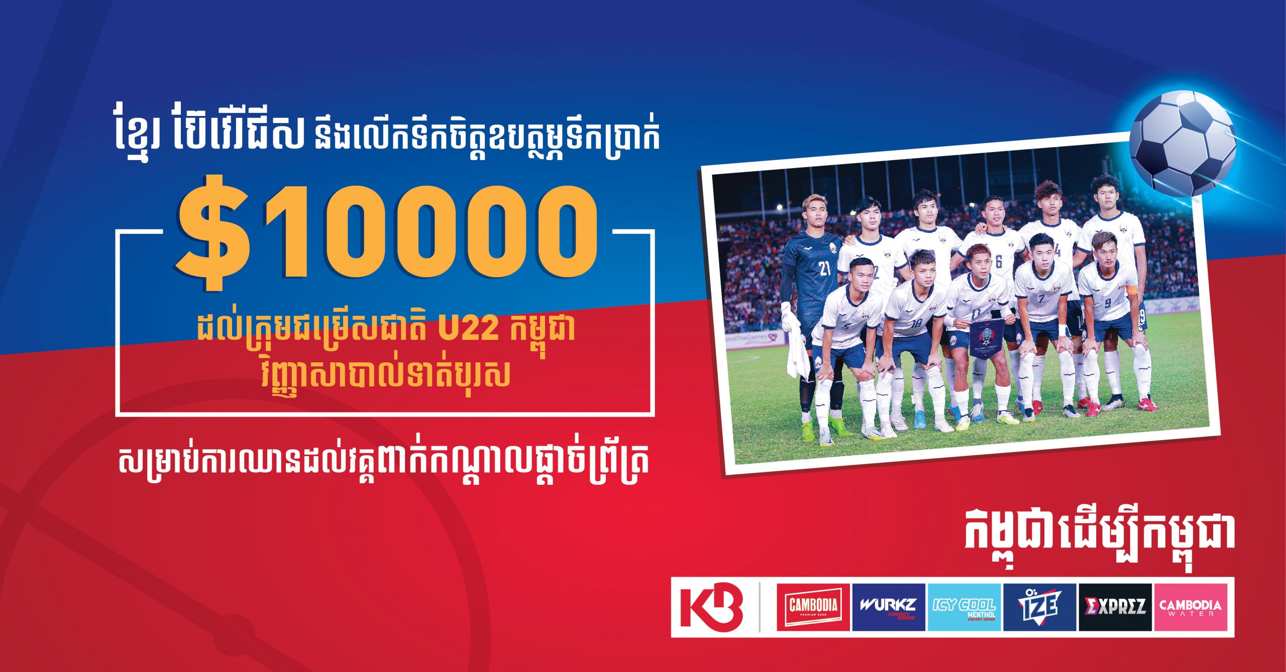 (ភ្នំពេញ)៖ ក្រុមហ៊ុន ខ្មែរ ប៊ែវើរីជីស នឹងឧបត្ថម្ភលើកទឹកចិត្តដល់ក្រុមកីឡាករបាល់ទាត់ជម្រើសជាតិ U22 កម្ពុជា ជាមួយនឹងទឹកប្រាក់ ១ម៉ឺនដុល្លារ បើសិនជាពួកគេបានឡើងទៅប្រកួតដល់វគ្គពាក់កណ្តាលផ្តាច់ព្រ័ត្របាន នៅរាត្រីថ្ងៃពុធនេះ។