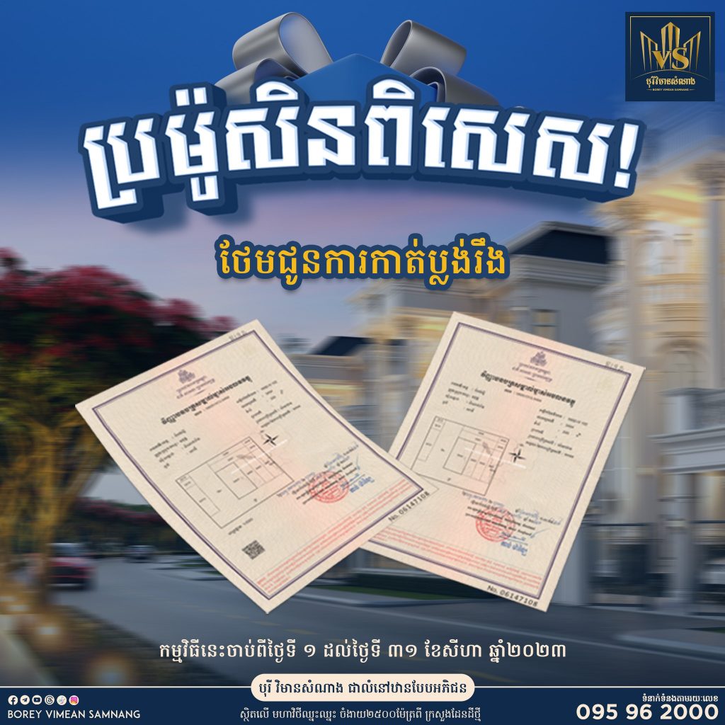 កាន់តែពិសេសសម្រាប់ខែសីហានេះ! បុរី វិមានសំណាង បានរៀបចំនូវប្រម៉ូសិនពិសេស និងអស្ចារ្យជូនអតិថិជនគឺ ទទួលបានការកាត់ប្លង់រឹងជូនដោយឥតគិតថ្លៃពី បុរី វិមានសំណាង។ ប្រម៉ូសិននេះចាប់អនុវត្តន៍ពីថ្ងៃនេះរហូតដល់ ថ្ងៃទី៣១ ខែសីហា ឆ្នាំ២០២៣ នេះ។
