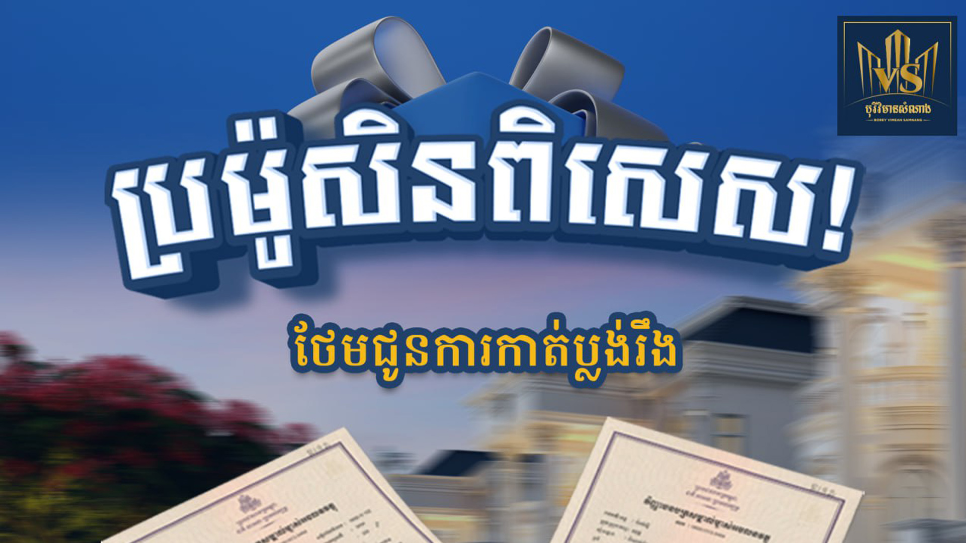 កាន់តែពិសេសសម្រាប់ខែសីហានេះ! បុរី វិមានសំណាង បានរៀបចំនូវកម្មវិធីប្រម៉ូសិនពិសេស និងអស្ចារ្យជូនអតិថិជន គឺទទួលបានការកាត់ប្លង់រឹងជូនដោយឥតគិតថ្លៃ ពី បុរី វិមានសំណាង។ ប្រម៉ូសិននេះចាប់អនុវត្តន៍ពីថ្ងៃនេះ រហូតដល់ថ្ងៃទី ៣១ ខែសីហា ឆ្នាំ២០២៣។