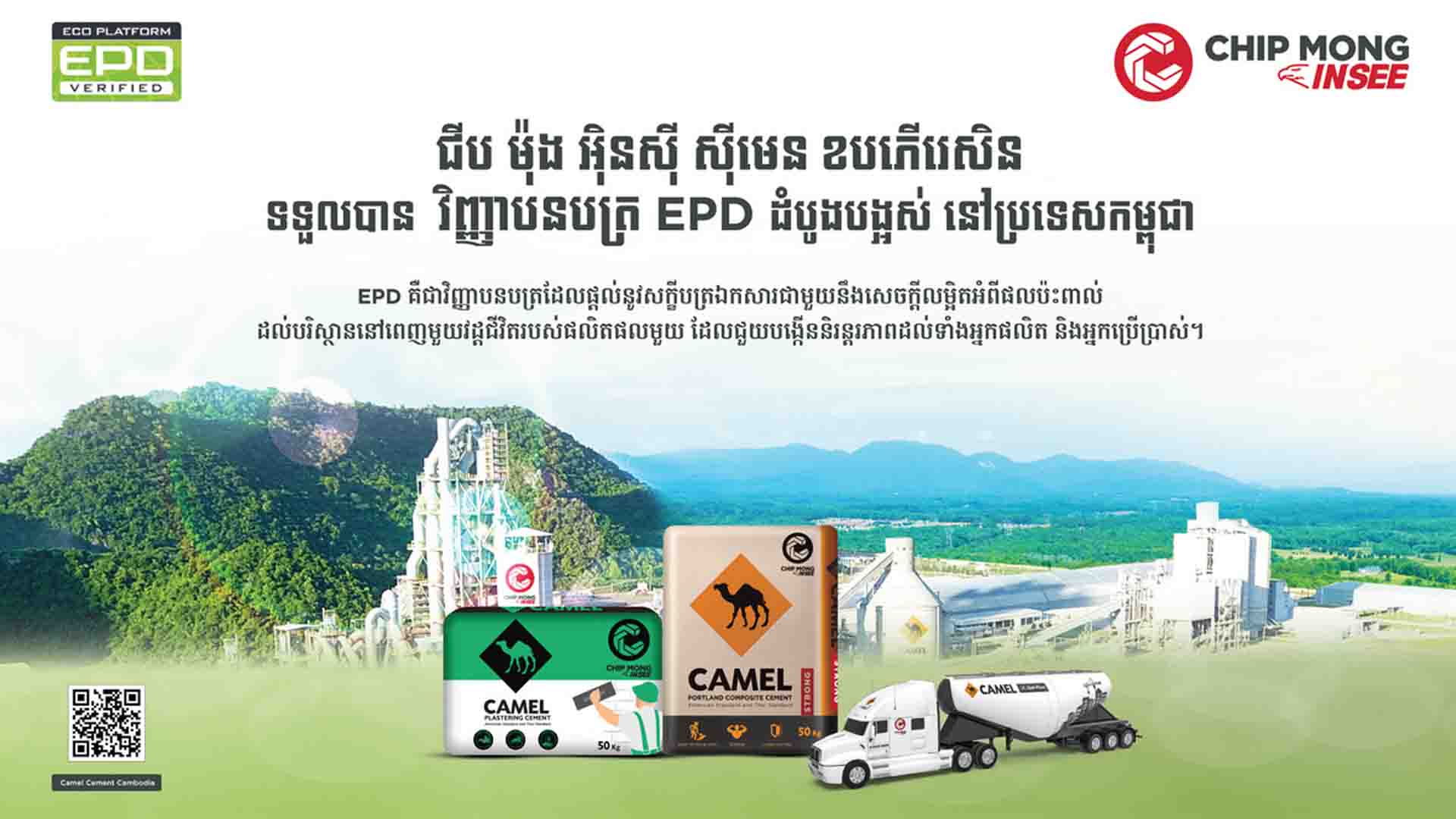 ក្រុមហ៊ុនស៊ីម៉ងត៍អូដ្ឋ ជីប ម៉ុង អ៊ិនស៊ី (CMIC) ដែលជាក្រុមហ៊ុនផលិតស៊ីម៉ងត៍ឈានមុខគេនៅកម្ពុជា បានបង្កើត ប្រវត្តិសាស្ត្រដោយក្លាយជាក្រុមហ៊ុនដំបូងគេក្នុងប្រទេសកម្ពុជា ដែលទទួលបានវិញ្ញាបនបត្រ ប្រកាសថាជាផលិតផលបរិស្ថាន (EPD) សម្រាប់ផលិតផលរបស់ខ្លួន និងជា សមិទ្ធផលដែលជាមោទនភាពយ៉ាងខ្លាំងរបស់ក្រុមហ៊ុន និងប្រទេសជាតិ។