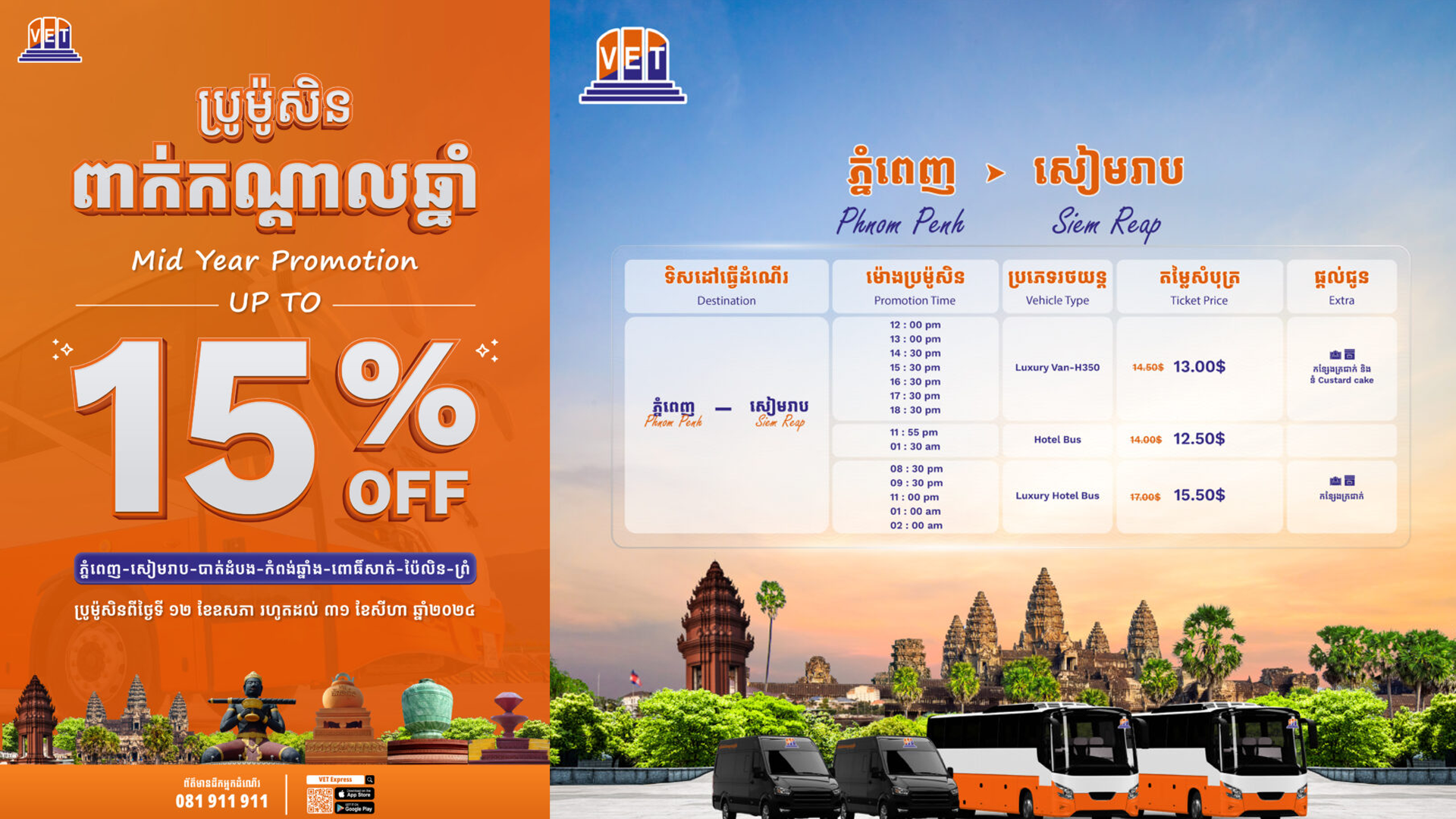 ក្រុមហ៊ុនវិរៈប៊ុនថាំ អេចប្រេស របស់អ្នកឧកញ៉ា សួរ វីរៈ ទម្លាក់ប្រម៉ូសិនពិសេសនៅពាក់កណ្ដាលឆ្នាំ២០២៤នេះ ដោយបញ្ចុះតម្លៃសំបុត្រសម្រាប់ធ្វើដំណើររហូតដល់ ១៥% សម្រាប់ទីតាំងចំនួន៧។