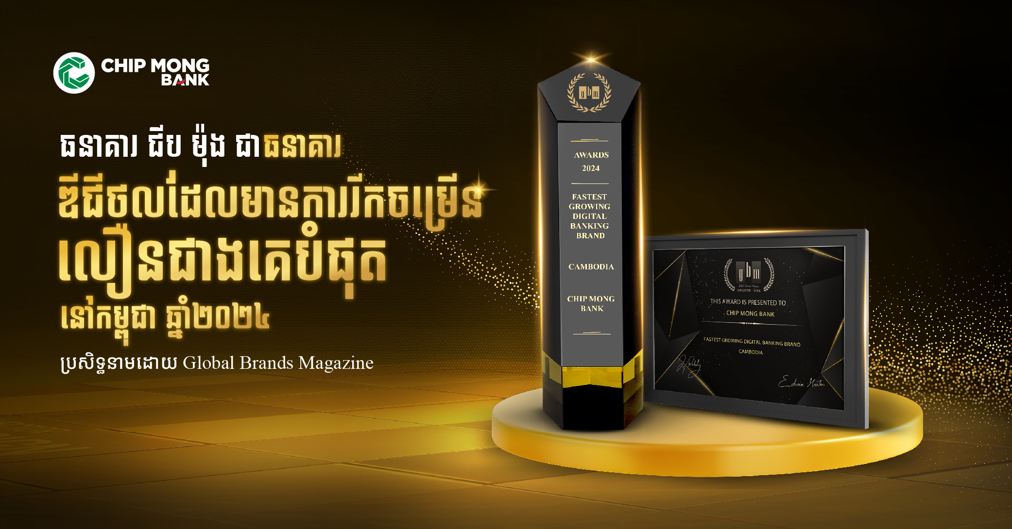 ការច្នៃប្រឌិត និងការរីកចម្រើនយ៉ាងឆាប់រហ័សរបស់ធនាគារ ជីប ម៉ុង លើការផ្តល់សេវាកម្មធនាគារបែបឌីជីថល ជូនអតិថិជននៅក្នុងប្រទេសកម្ពុជា ត្រូវបានទស្សនាវដ្តី Global Brands Magazine ផ្តល់នូវពានរង្វាន់ឆ្នើម Global Brand Awards 2024 ដោយប្រសិទ្ធនាមថាជា “ធនាគារឌីជីថលដែលមានការរីកចម្រើនលឿនជាងគេបំផុតនៅកម្ពុជា” ក្នុងឆ្នាំ២០២៤ នេះ។