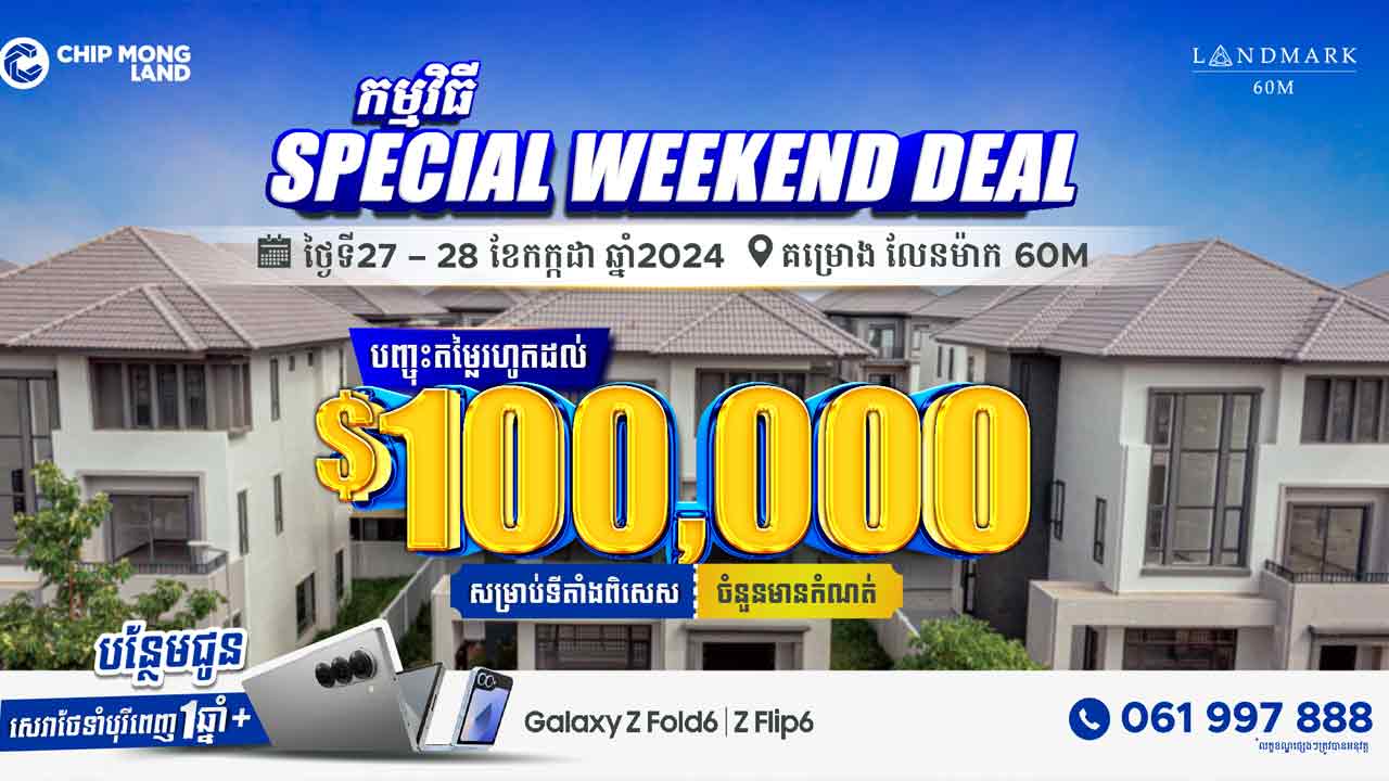 ត្រឡប់មកវិញហើយ កម្មវិធី 𝐒𝐩𝐞𝐜𝐢𝐚𝐥 𝐖𝐞𝐞𝐤𝐞𝐧𝐝 𝐃𝐞𝐚𝐥 𝟏ឆ្នាំមានតែម្តង! ទីតាំងផ្ទះល្អៗ បញ្ចុះតម្លៃរហូតដល់ $𝟏𝟎𝟎,𝟎𝟎𝟎 មិនធ្លាប់មាន ព្រមទាំងបន្ថែមជូន៖