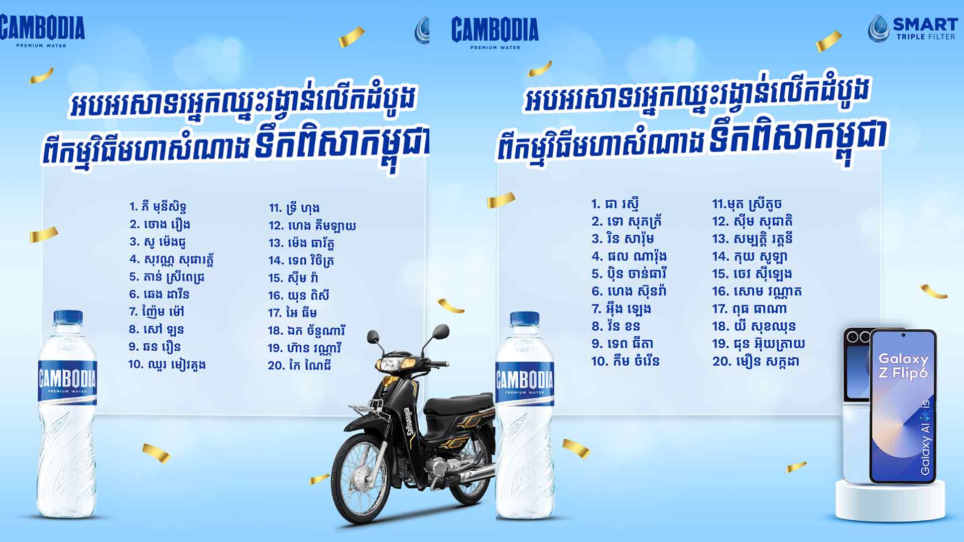 អ្នកឈ្នះទូរស័ព្ទ Samsung Galaxy Z Flip 6 ស៊េរីថ្មីស៊ីវីល័យទាំង ២០រូប៖ ១). ជា រស្មី, ២). ទោ សុភ័ក្រ, ៣). រិន សារ៉ុម, ៤). ផល ណារ៉ុង, ៥). ប៉ិន ចាន់ធារី, ៦). ហេង ស៊ុនរ៉ា, ៧). អ៊ឹង ឡេង, ៨). វ៉ន ខន, ៩). ទេព ធីតា, ១០). កឹម ចំរើន, ១១). មុត ស្រីតូច, ១២). ស៊ីម សុជាតិ, ១៣). សម្បត្តិ រត្តនី, ១៤). កុយ សូឡា, ១៥). ចេវ ស៊ីឡេង, ១៦). សោម វណ្ណាត, ១៧). ពុធ ធាណា, ១៨). យី សុខឈុន, ១៩). ជុន អ៊ុយត្រាយ និងទី២០). មឿន សក្កដា។