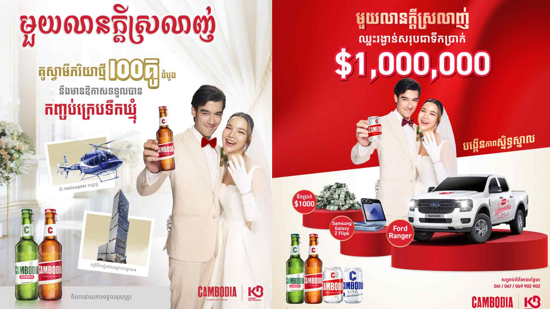 ភ្នំពេញ៖ ត្រលប់មកវិញហើយ កម្មវិធីរង្វាន់អាពាហ៍ពិពាហ៍ដ៏អស្ចារ្យសម្រាប់គូស្នេហ៍របស់ CAMBODIA BEER ដោយនឹងទទួលបាន ការជិះឧទ្ធម្ភាគចក្រ, ញ៉ាំអាហារពេលល្ងាបបែបរ៉ូមែនទិក, Honeymoon នៅសណ្ឋាគារលំដាប់ពិភពលោក, ទូរស័ព្ទ Samsung Galaxy A55 និងសន្លឹកឆ្នោតផ្សងសំណាងដែលមានឱកាសឈ្នះរង្វាន់រថយន្ត Ford Ranger ស៊េរីថ្មី, ទូរស័ព្ទSamsung Galaxy Z-Flip 6 និងប្រាក់សុទ្ធ ១,០០០ដុល្លារ ជាច្រើនរង្វាន់។
