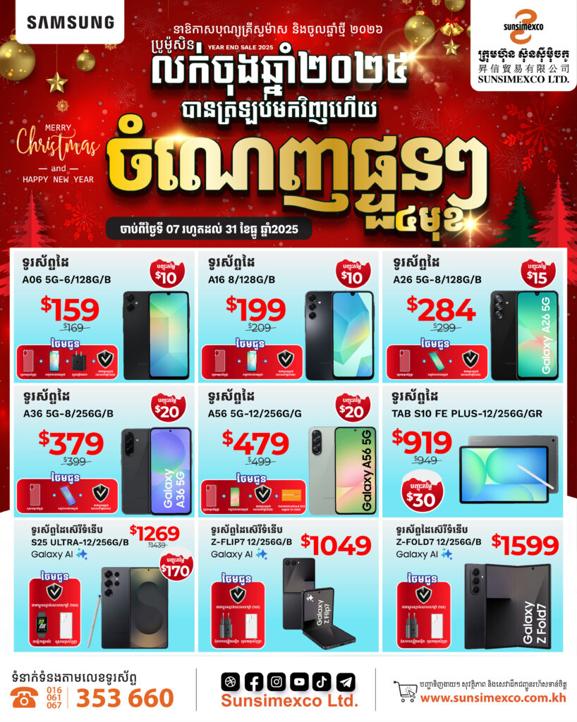 ដំណាច់ឆ្នាំ ២០២៥ និងស្វាគមន៍ឆ្នាំថ្មី ឆ្នាំ២០២៦ ខាងមុខនេះក្រុមហ៊ុនស៊ុនស៊ីម៉ិចកូ បានរៀបចំកម្មវិធីលក់បញ្ចុះតម្លៃយ៉ាងច្រើន រាល់ការជាវគ្រឿងអេឡិចត្រូនិច គ្រឿងសង្ហារឹម និងទូរស័ព្ទដៃគ្រប់ប្រភេទទាំងអស់ពីសាខាណាមួយរបស់ ស៊ុនស៊ីម៉ិចកូ ក្នុងប្រូម៉ូសិនលក់ចុងឆ្នាំនេះអតិថិជននឹងទទួលបានការថែមជូនកាដូផ្ទួនៗគ្នារហូតដល់ ៤ មុខដូចជា៖