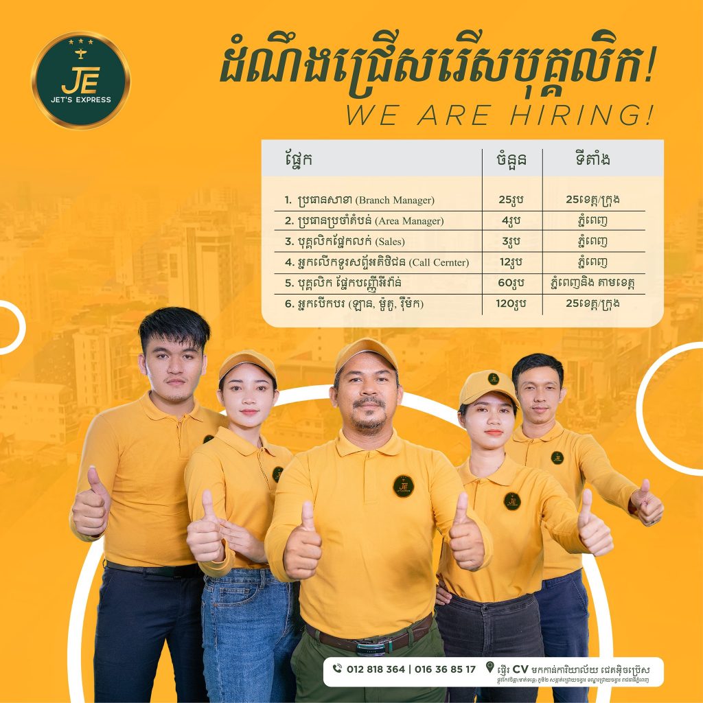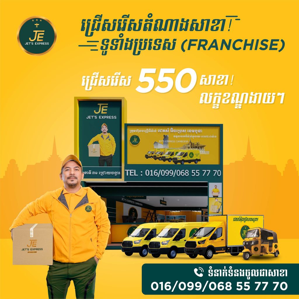 កាន់តែពិសេសទៀតនោះ ក្រុមហ៊ុន Jet’s Express Cambodia ត្រូវការជ្រើសរើសតំណាងសាខា ២៥ខេត្ត/ក្រុងជ្រើសរើស 550 សាខាបន្ថែម ជាមួយនឹងទុនចាប់ផ្តើមតិច ចាប់ពី $1500 ទៅប្រាក់ចំណេញអាចរកបាន ពី $1500 – $6000 ក្នុងមួយខែ ដែលមានទុនកម្ចី សម្រាប់អជីវកម្មនេះស្រាប់។ សូមទាក់ទងមកឥលូវនេះ៖ Smart: 016 557 770 Cellcard: 099 557 770 Metfone: 068 557 770 ឬទៅទីតាំងផ្ទាល់នៅផ្លូវមេគង្គ (មាត់ទន្លេ) ភូមិ២ សង្កាត់ ជ្រោយចង្វារ ខណ្ឌជ្រោយចង្វារ រាជធានីភ្នំពេញ Google Map: https://goo.gl/maps/84ugspq5e2wagCmx8