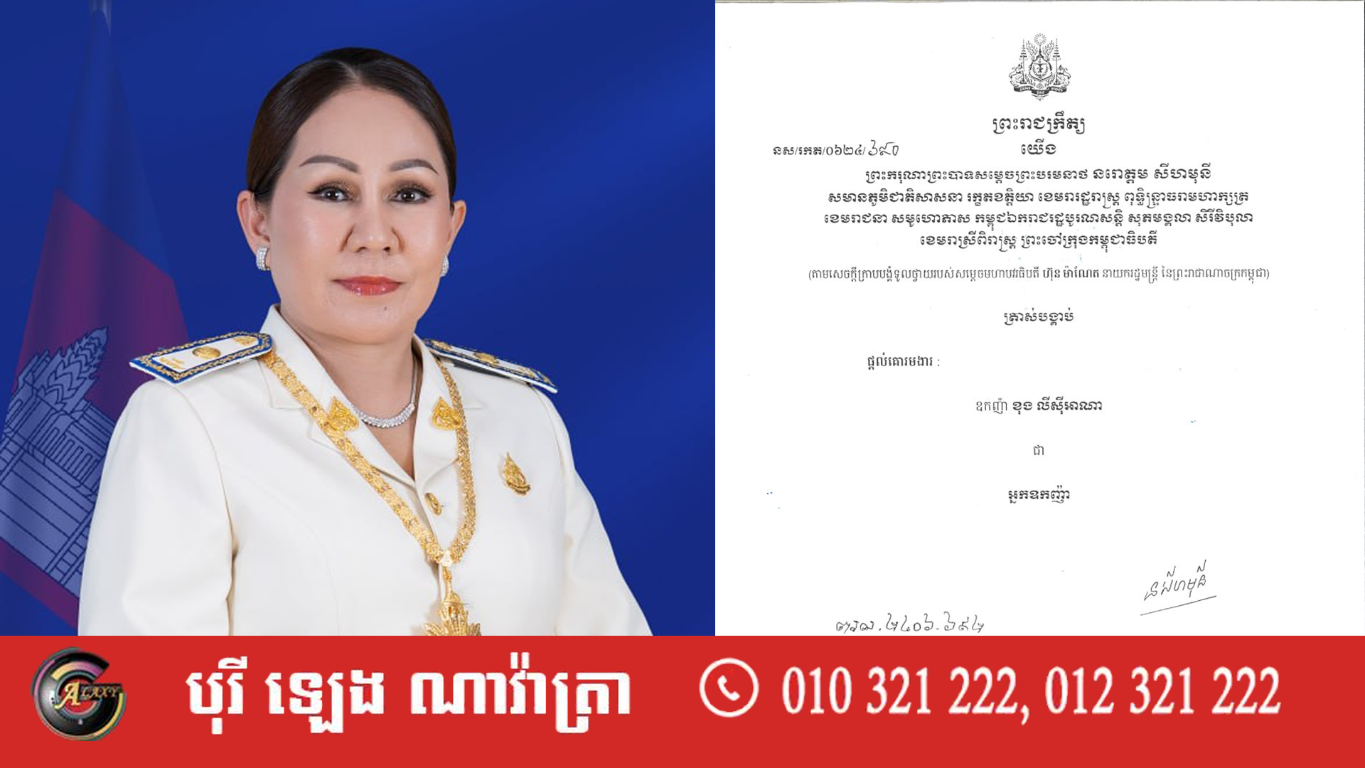 លោកស្រីឧកញ៉ា ខុង លីស៊ីអាណា ត្រូវបានព្រះមហាក្សត្រចេញព្រះរាជក្រឹត្យ ត្រាស់បង្គាប់ផ្តល់គោរមងារ «ឧកញ៉ា» កាលពីថ្ងៃទី២៧ ខែកក្កដា ឆ្នាំ២០២៣។