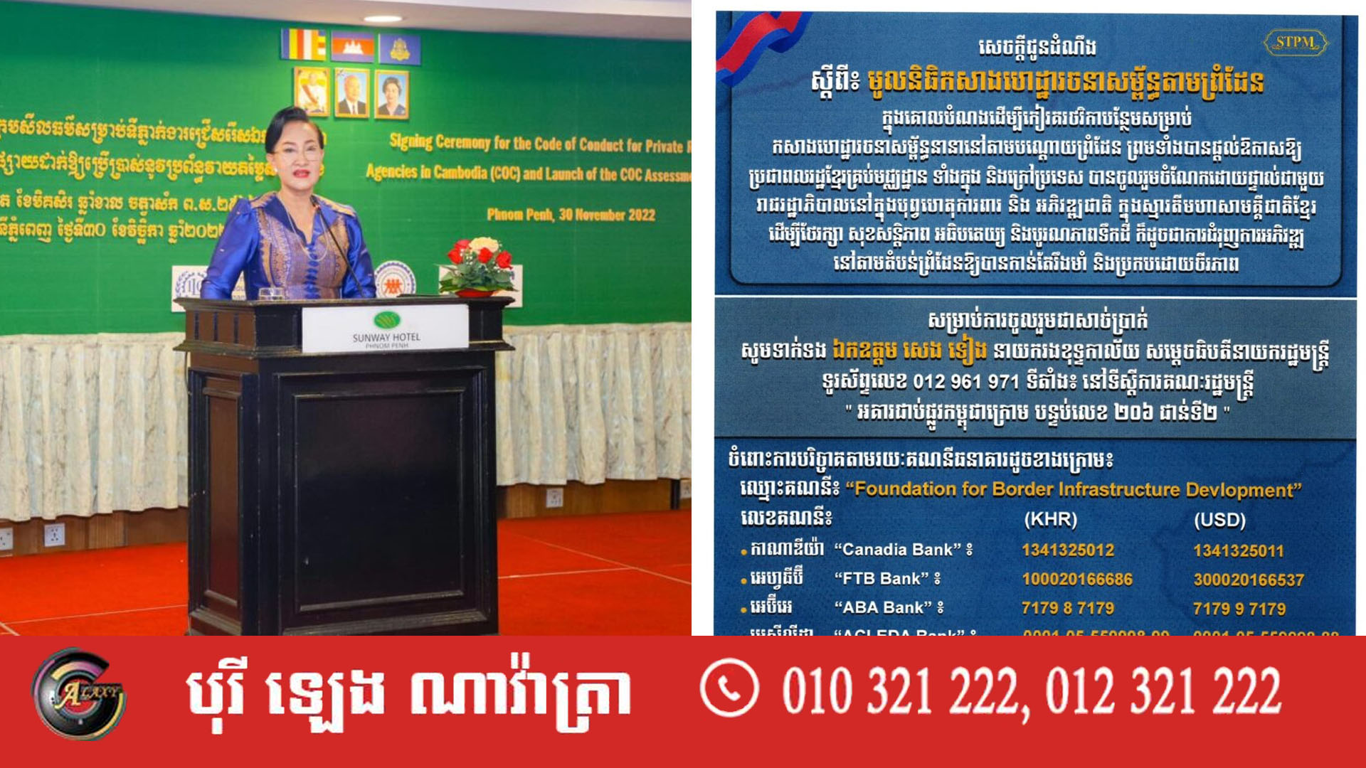 លោកជំទាវ អ្នកឧកញ៉ា អ៊ឹង ស៊ាងរិទ្ធី សមាជិកសមាគមឧកញ៉ាកម្ពុជា ចូលរួមបរិច្ចាគថវិកាចំនួន ២០លានរៀល ដល់ «មូលនិធិ​កសាង​ហេដ្ឋា​រចនា​សម្ព័ន្ធតាម​ព្រំដែន» ដើម្បី​ចូលរួម​ជាមួយ​រាជរដ្ឋាភិបាល សម្រាប់កសាងហេដ្ឋារចនា​សម្ព័ន្ធ​នានា នៅតាម​បណ្តោយព្រំដែន ដោយ​ផ្ដោតលើការ​កសាង​ផ្លូវក្រវាត់ព្រំដែន។