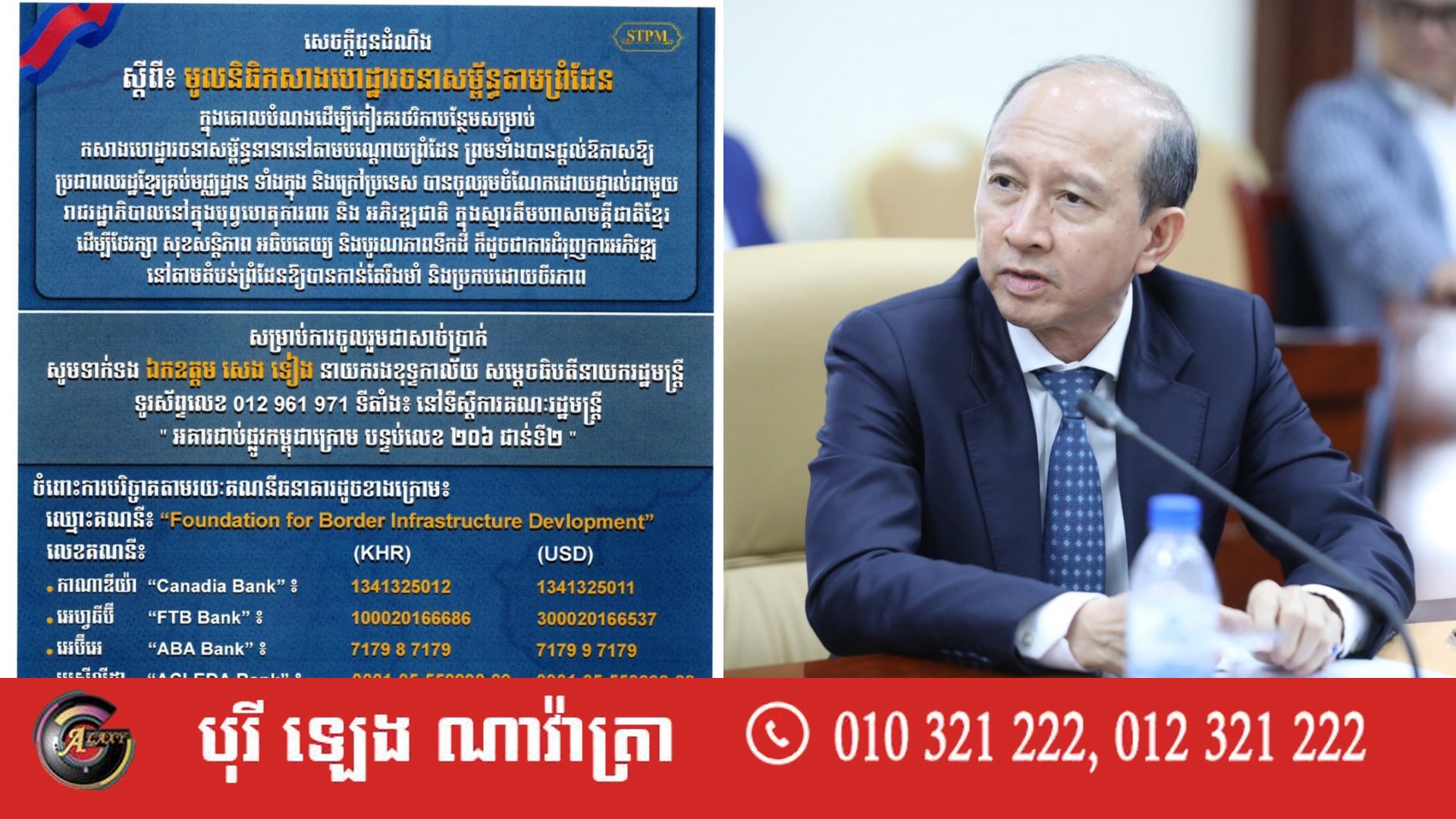 សម្រាប់ការចង់ចូលរួមតាមរយៈសាច់ប្រាក់ គឺចូលរួមតាម លោក សេង ទៀង នាយករងខុទ្ទកាល័យ សម្តេច ធិបតីនាយករដ្ឋមន្ត្រី ទូរស័ព្ទលេខ 012 961 971។ ទីតាំង៖ នៅទីស្តីការគណៈរដ្ឋមន្ត្រី “អគារជាប់ ផ្លូវកម្ពុជា ក្រោម បន្ទប់លេខ ២០៦ ជាន់ទី២” ឬអាចបរិច្ចាគតាមរយៈគណនីធនាគារឈ្មោះ៖ «Foundation for Border Infrastructure Development»៕