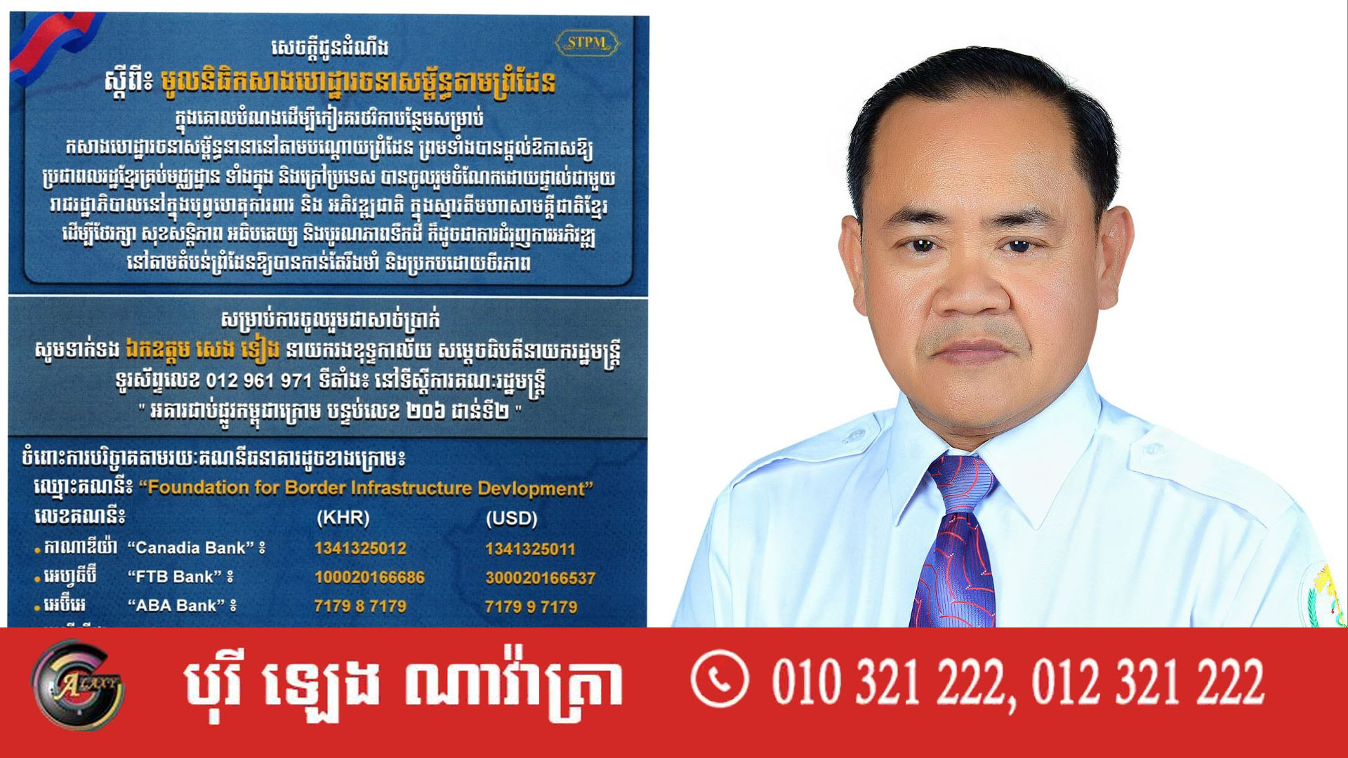 ជាមួយនឹងការជូនដំណឹងនេះ សម្តេចធិបតី ហ៊ុន ម៉ាណែត ក៏បានអំពាវនាវដល់បងប្អូនប្រជាពលរដ្ឋខ្មែរទាំង​ក្នុងនិង​ក្រៅប្រទេស មេត្តាចូលរួមបរិច្ចាគវិភាគទានឱ្យបានផុលផុសតាមការស្ម័គ្រចិត្តក្នុង «មូលនិធិកសាង​ហេដ្ឋារចនាសម្ព័ន្ធ​តាមព្រំដែន» សំដៅរួមគ្នាក្នុងធ្លុងមហាសាមគ្គីជាតិខ្មែរដើម្បីថែរក្សាសុខសន្តិភាព អធិបតេយ្យ​ភាពជាតិ និងបូរណភាពទឹកដី ក៏ដូចជាការជំរុញការអភិវឌ្ឍតាមតំបន់ព្រំដែនឱ្យបានកាន់តែរឹងមាំ និងប្រកប​ដោយ​ចីរភាព៕