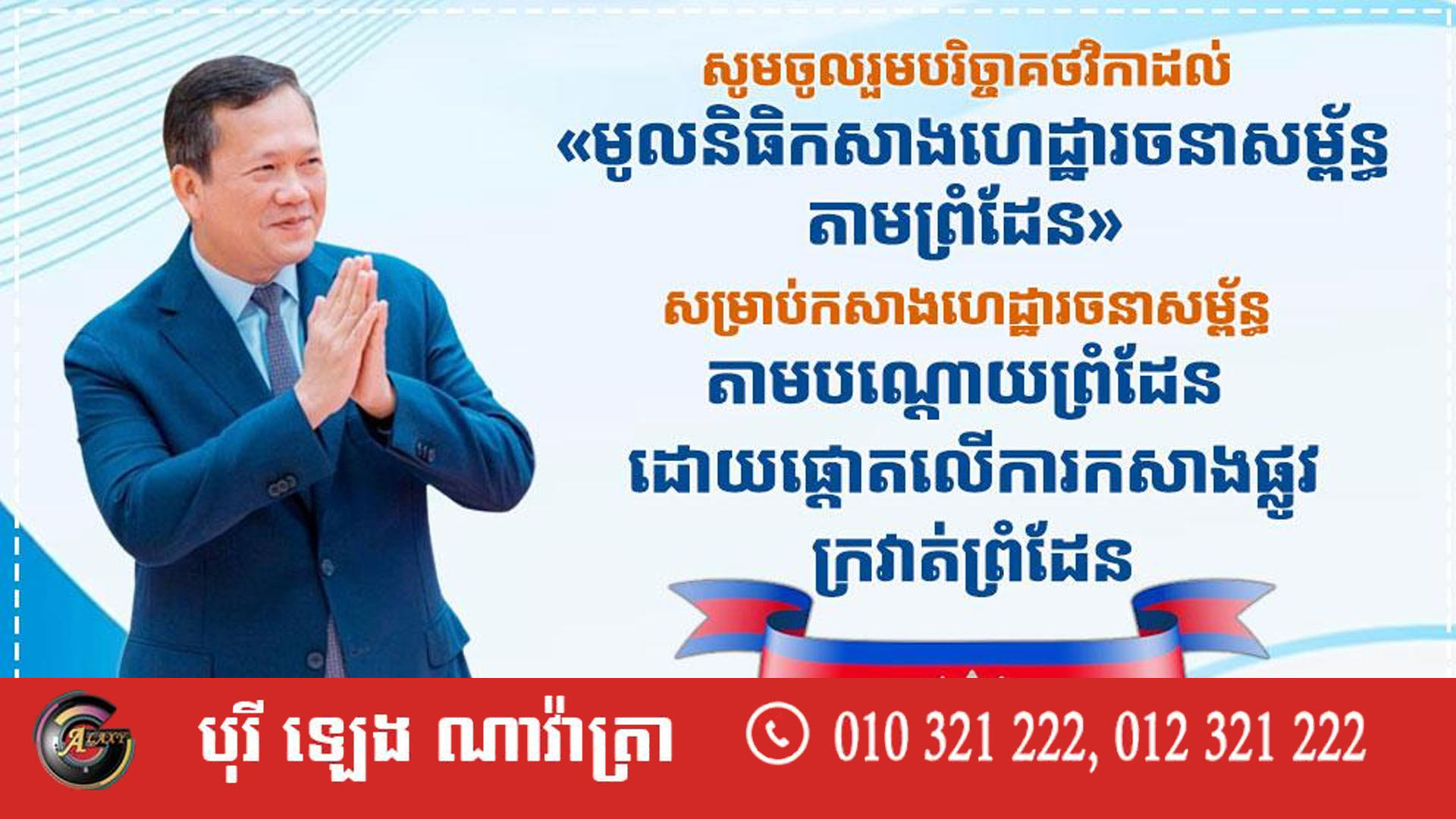 ជាមួយនឹងការជូនដំណឹងនេះ សម្តេចធិបតី ហ៊ុន ម៉ាណែត ក៏បានអំពាវនាវដល់បងប្អូនប្រជាពលរដ្ឋខ្មែរទាំងក្នុងនិងក្រៅប្រទេស មេត្តាចូលរួមបរិច្ចាគវិភាគទានឱ្យបានផុលផុសតាមការស្ម័គ្រចិត្តក្នុង «មូលនិធិកសាងហេដ្ឋារចនាសម្ព័ន្ធតាមព្រំដែន» សំដៅរួមគ្នាក្នុងធ្លុងមហាសាមគ្គីជាតិខ្មែរដើម្បីថែរក្សាសុខសន្តិភាព អធិបតេយ្យភាពជាតិ និងបូរណភាពទឹកដី ក៏ដូចជាការជំរុញការអភិវឌ្ឍតាមតំបន់ព្រំដែនឱ្យបានកាន់តែរឹងមាំ និងប្រកបដោយចីរភាព៕