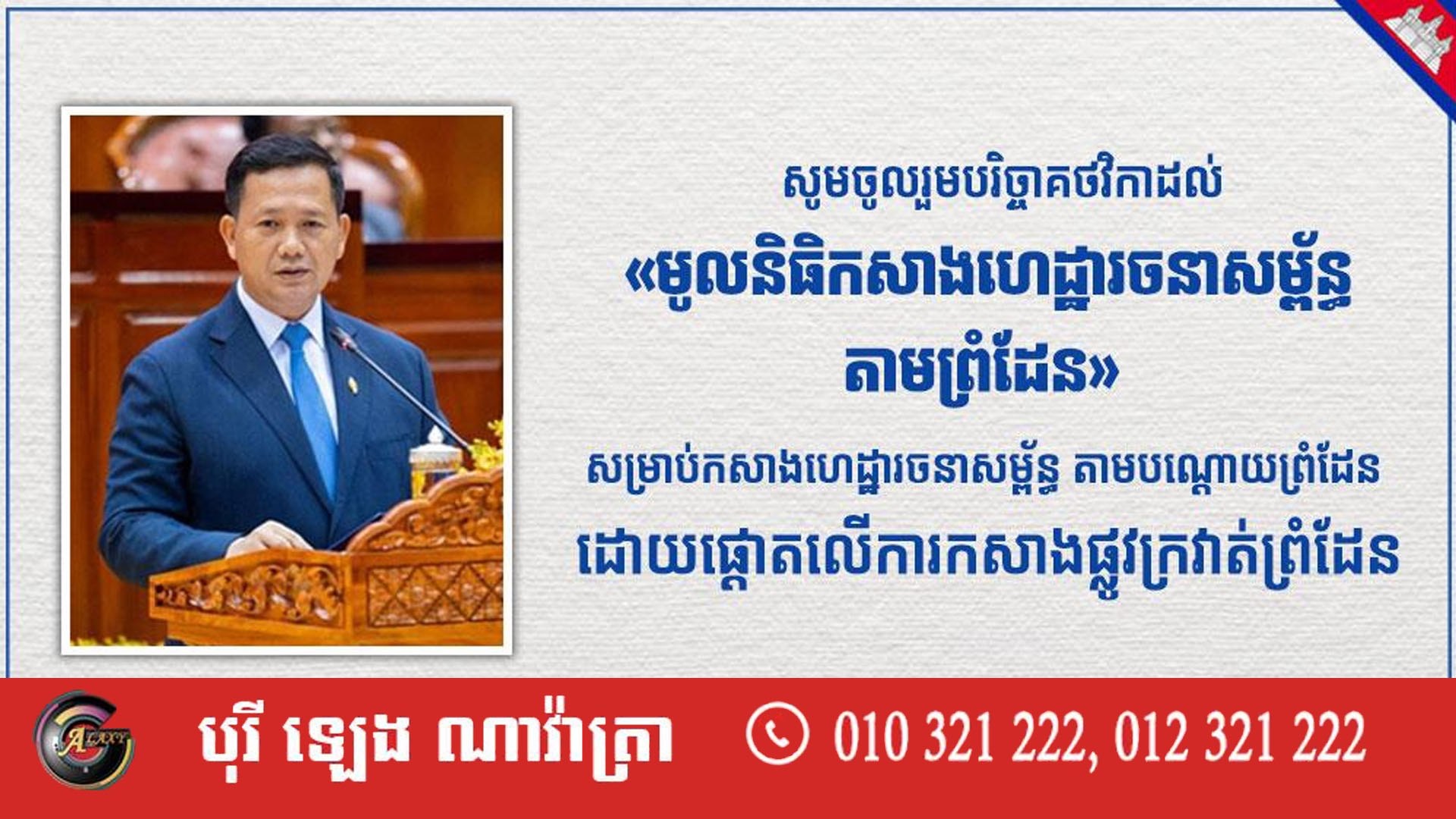 ជាមួយនឹងការជូនដំណឹងនេះ សម្តេចធិបតី ហ៊ុន ម៉ាណែត ក៏បានអំពាវនាវដល់បងប្អូនប្រជាពលរដ្ឋខ្មែរទាំង ក្នុងនិង ក្រៅប្រទេស មេត្តាចូលរួមបរិច្ចាគវិភាគទានឱ្យបានផុលផុសតាមការស្ម័គ្រចិត្តក្នុង «មូលនិធិកសាង ហេដ្ឋារចនាសម្ព័ន្ធ តាមព្រំដែន» សំដៅរួមគ្នាក្នុងធ្លុងមហាសាមគ្គីជាតិខ្មែរដើម្បីថែរក្សាសុខសន្តិភាព អធិបតេយ្យ ភាពជាតិ និងបូរណភាពទឹកដី ក៏ដូចជាការជំរុញការអភិវឌ្ឍតាមតំបន់ព្រំដែនឱ្យបានកាន់តែរឹងមាំ និងប្រកប ដោយ ចីរភាព។
