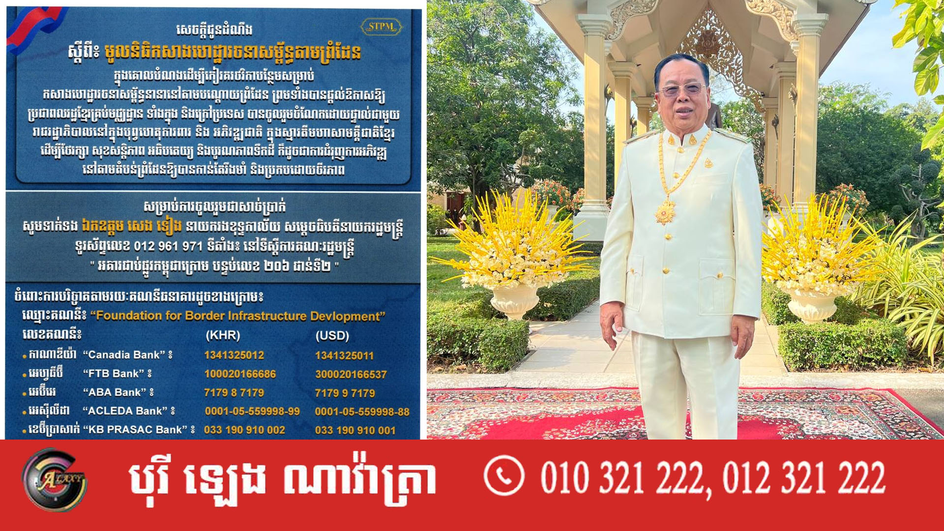 សម្រាប់ការចង់ចូលរួមតាមរយៈសាច់ប្រាក់ គឺចូលរួមតាម លោក សេង ទៀង នាយករងខុទ្ទកាល័យ សម្តេច ធិបតីនាយករដ្ឋមន្ត្រី ទូរស័ព្ទលេខ 012 961 971។ ទីតាំង៖ នៅទីស្តីការគណៈរដ្ឋមន្ត្រី “អគារជាប់ ផ្លូវកម្ពុជា ក្រោម បន្ទប់លេខ ២០៦ ជាន់ទី២” ឬអាចបរិច្ចាគតាមរយៈគណនីធនាគារឈ្មោះ៖ «Foundation for Border Infrastructure Development»៕