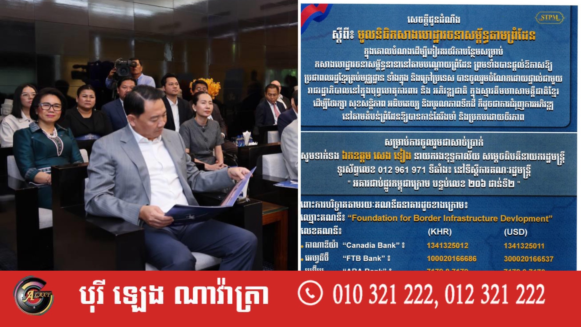 ការចូលរួមបរិច្ចាគថវិកាខាងលើនេះ តបតាមការប្រកាសរបស់ សម្តេចធិបតី ហ៊ុន ម៉ាណែត នាយករដ្ឋមន្រ្តីនៃកម្ពុជា សម្រេចបង្កើត «មូលនិធិកសាង ហេដ្ឋា រចនាសម្ព័ន្ធតាមព្រំដែន» ក្នុងគោលបំណងដើម្បី កៀរគរថវិកាបន្ថែម សម្រាប់កសាងហេដ្ឋារចនាសម្ព័ន្ធនានា នៅតាមបណ្តោយព្រំដែន ព្រមទាំងបានផ្តល់ឱកាស ឱ្យប្រជាពលរដ្ឋខ្មែរគ្រប់មជ្ឈដ្ឋាន ទាំងក្នុង និងក្រៅប្រទេស បានចូលរួមចំណែកដោយផ្ទាល់ជាមួយ រាជរដ្ឋាភិបាល នៅក្នុងបុព្វហេតុការពារ និងអភិវឌ្ឍជាតិ ក្នុងស្មារតី មហាសាមគ្គីជាតិខ្មែរ ដើម្បីថែរក្សា សុខសន្តិភាព អធិបតេយ្យ និងបូរណភាពទឹកដី ក៏ដូចជាការជំរុញការអភិវឌ្ឍ នៅតាមតំបន់ព្រំដែនឱ្យបានកាន់តែរឹងមាំ និងប្រកបដោយចីរភាព។