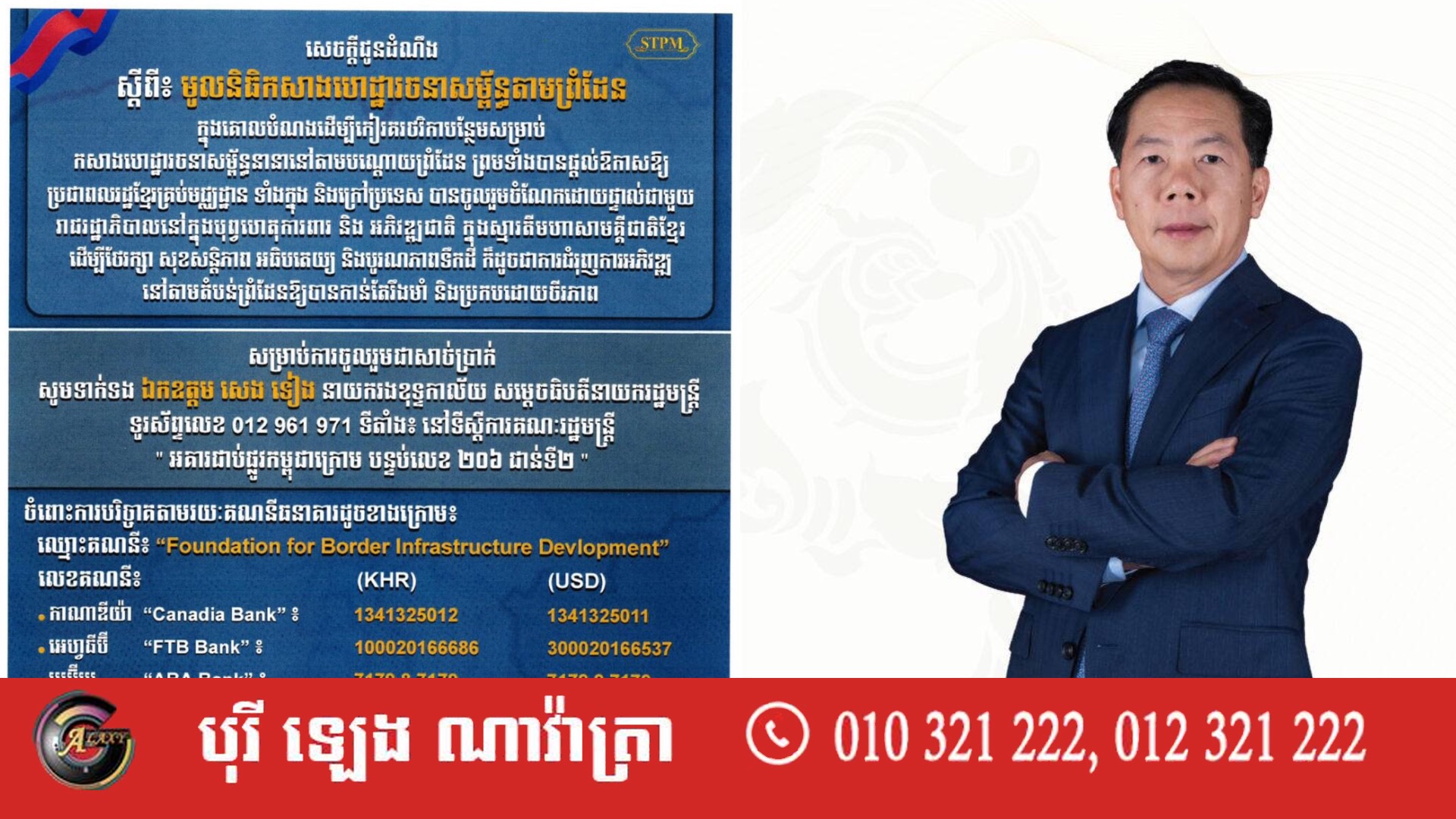 សម្រាប់ការចង់ចូលរួមតាមរយៈសាច់ប្រាក់ គឺចូលរួមតាម លោក សេង ទៀង នាយករងខុទ្ទកាល័យ សម្តេច ធិបតីនាយករដ្ឋមន្ត្រី ទូរស័ព្ទលេខ 012 961 971។ ទីតាំង៖ នៅទីស្តីការគណៈរដ្ឋមន្ត្រី “អគារជាប់ ផ្លូវកម្ពុជា ក្រោម បន្ទប់លេខ ២០៦ ជាន់ទី២” ឬអាចបរិច្ចាគតាមរយៈគណនីធនាគារឈ្មោះ៖ «Foundation for Border Infrastructure Development»៕