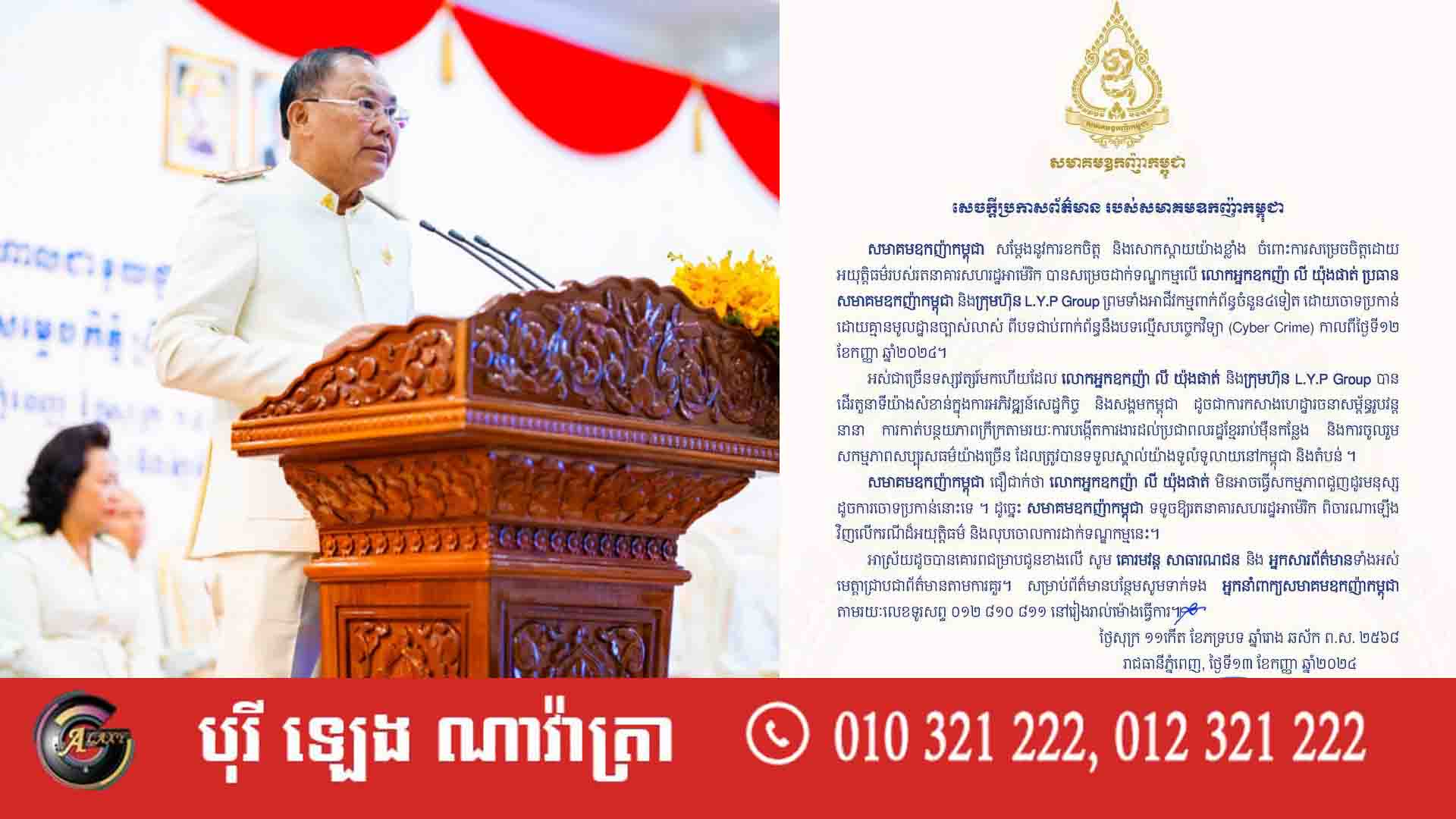 សមាគមឧកញ៉ាកម្ពុជា សម្តែងនូវការខកចិត្ត និងសោកស្តាយយ៉ាងខ្លាំង ចំពោះការសម្រេចចិត្តដោយអយុត្តិធម៌របស់រតនាគារសហរដ្ឋអាម៉េរិក បានសម្រេចដាក់ទណ្ឌកម្មលើ លោកអ្នកឧកញ៉ា លី យ៉ុងផាត់ ប្រធានសមាគមឧកញ៉ាកម្ពុជា និងក្រុមហ៊ុន L.Y.P Group ព្រមទាំងអាជីវកម្មពាក់ព័ន្ធចំនួន៤ទៀត ដោយចោទប្រកាន់ដោយគ្មានមូលដ្ឋានច្បាស់លាស់ ពីបទជាប់ពាក់ព័ន្ធនឹងបទល្មើសបច្ចេកវិទ្យា (Cyber Crime) កាលពីថ្ងៃទី១២ ខែកញ្ញា ឆ្នាំ២០២៤។