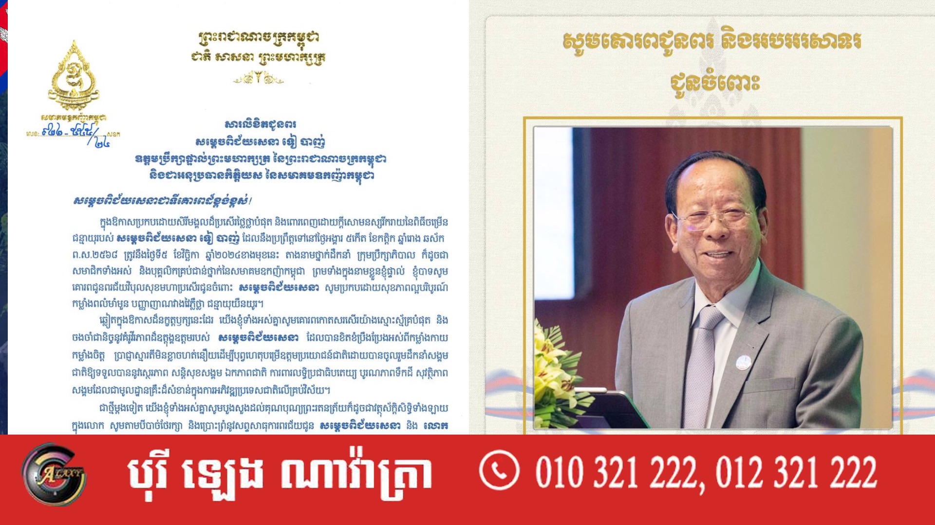 សមាគមឧកញ៉ាកម្ពុជា សូមផ្ញើសារលិខិតជូនពរ សម្ដេចពិជ័យសេនា ទៀ បាញ់ ក្នុងឱកាសសិរីមង្គលដ៏បវរ នៃពិធីចម្រើនជន្មាយុ