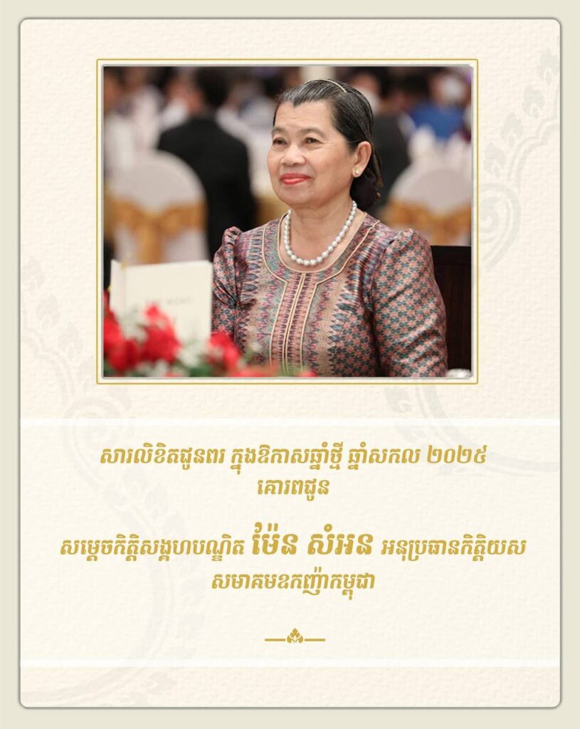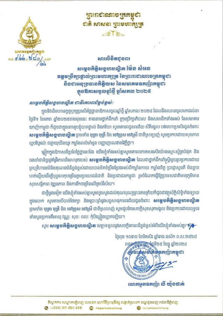 លោកអ្នកឧកញ៉ា លី យ៉ុងផាត់ ប្រធានសមាគមឧកញ៉ាកម្ពុជា ព្រមទាំងថ្នាក់ដឹកនាំ ក្រុមប្រឹក្សាភិបាល និងសមាជិកទាំងអស់ នៃសមាគមឧកញ៉ាកម្ពុជា សូមផ្ញើសារលិខិតជូនពរ សម្តេចកិត្តិសង្គហបណ្ឌិត ម៉ែន សំអន ឧត្តមប្រឹក្សាផ្ទាល់ព្រះមហាក្សត្រ នៃព្រះរាជាណាចក្រកម្ពុជា និងជាអនុប្រធានកិត្តិយស នៃសមាគមឧកញ៉ាកម្ពុជា ក្នុងឱកាសឆ្នាំថ្មី ឆ្នាំសកល ២០២៥។