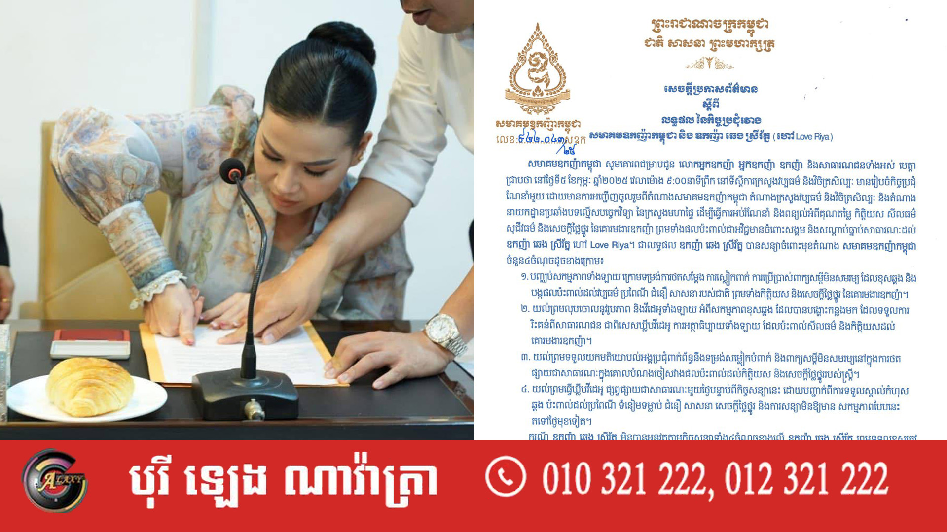 សមាគមឧកញ៉ាកម្ពុជា នៅរសៀលថ្ងៃទី៥ ខែកុម្ភៈ ឆ្នាំ២០២៥នេះ បានចេញសេចក្តីប្រកាសព័ត៌មាន ស្តីពីលទ្ធផល នៃកិច្ចប្រជុំរវាងសមាគមឧកញ៉ាកម្ពុជា និង ឧកញ៉ា ឆេង ស្រីរ័ត្ន ហៅ Love Riya ដោយមានការចូលរួមពីតំណាងក្រសួងវប្បធម៌ និងវិចិត្រសិល្បៈ និងតំណាងនាយកដ្ឋានប្រឆាំងបទល្មើសបច្ចេកវិទ្យា នៅទីស្តីការក្រសួងវប្បធម៌ និងវិចិត្រសិល្បៈ កាលពីព្រឹកមិញ។