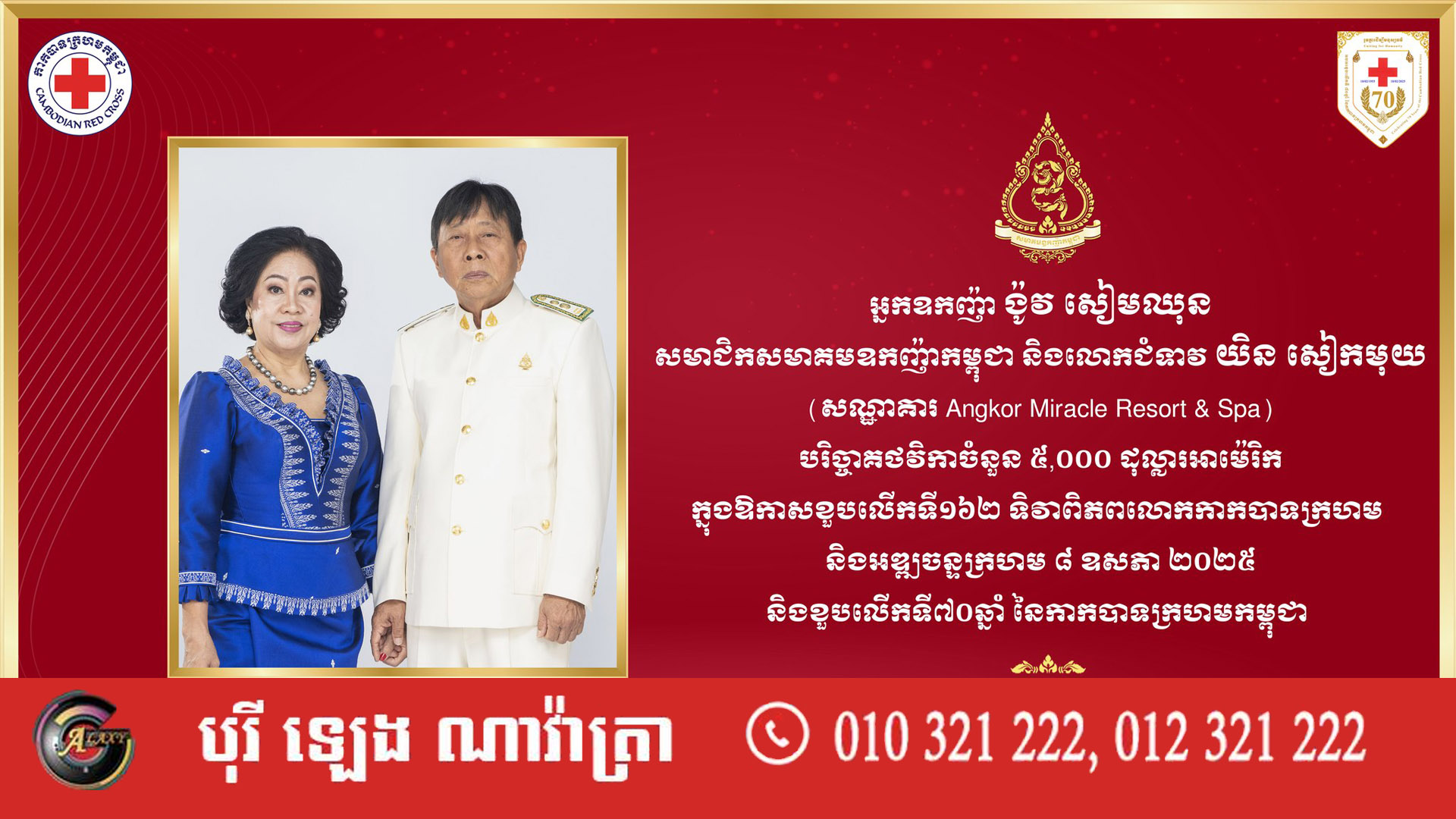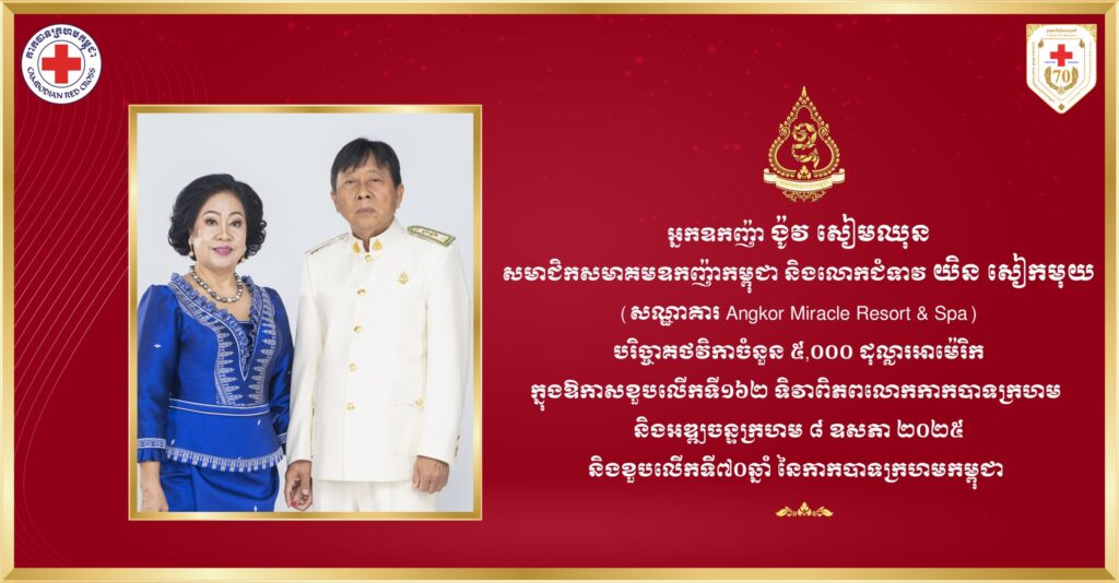 អ្នកឧកញ៉ា ង៉ូវ សៀមឈុន សមាជិកសមាគមឧកញ៉ាកម្ពុជា និងលោកជំទាវ យិន សៀកមុយ (សណ្ឋាគារ Angkor Miracle Resort & Spa) បរិច្ចាគថវិកាចំនួន ៥,០០០ ដុល្លារអាម៉េរិក ក្នុងឱកាសខួបលើកទី១៦២ ទិវាពិភពលោកកាកបាទក្រហម និងអឌ្ឍចន្ទក្រហម ៨ ឧសភា ឆ្នាំ២០២៥ និងខួបលើកទី៧០ឆ្នាំ នៃកាកបាទក្រហមកម្ពុជា។