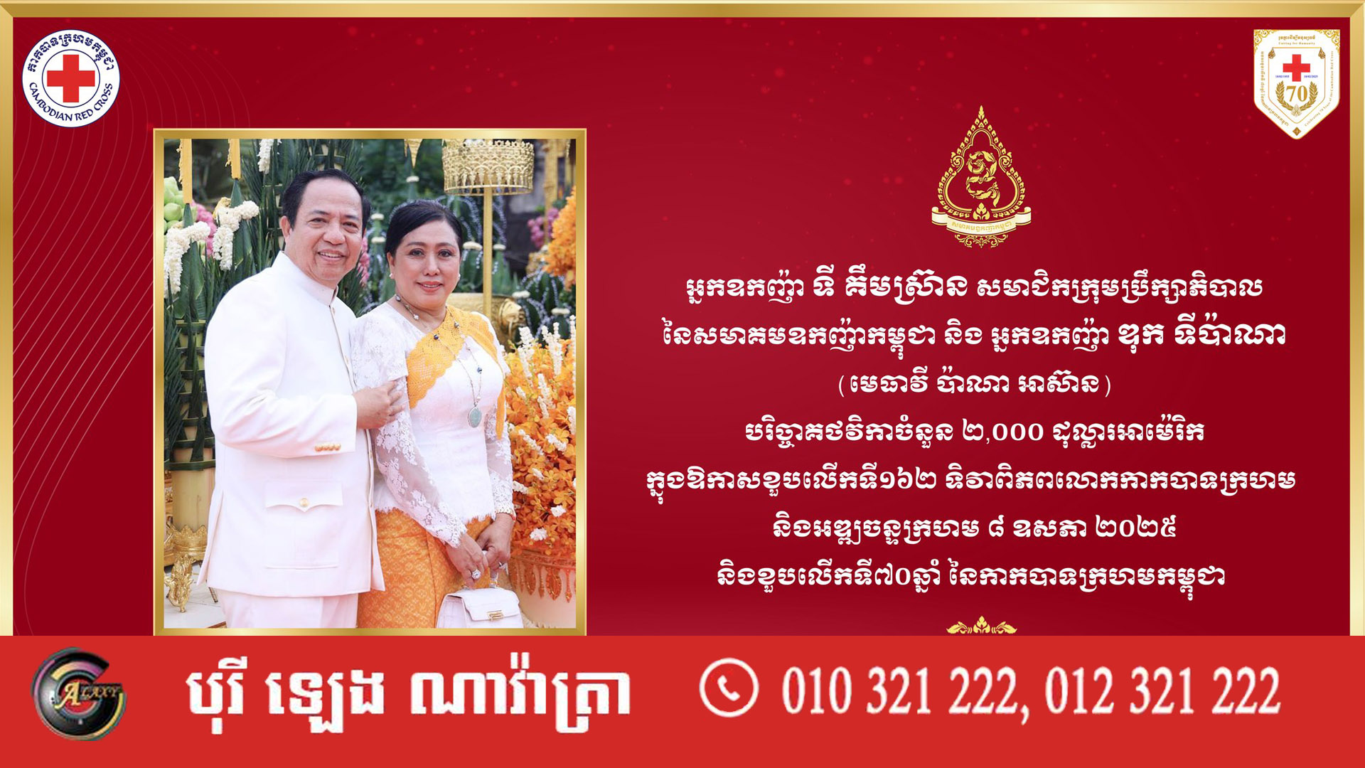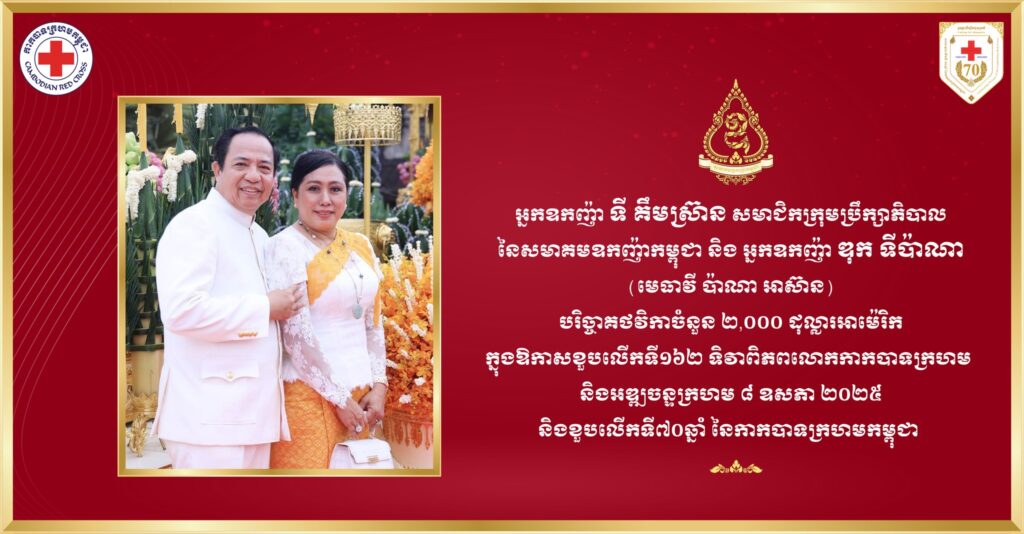 អ្នកឧកញ៉ា ទី គឹមស្រ៊ាន សមាជិកក្រុមប្រឹក្សាភិបាល នៃសមាគមឧកញ៉ាកម្ពុជា និង អ្នកឧកញ៉ា ឌុក ទីប៉ាណា (មេធាវី ប៉ាណា អាស៊ាន) បរិច្ចាគថវិកាចំនួន ២,០០០ ដុល្លារអាម៉េរិក ក្នុងឱកាសខួបលើកទី១៦២ ទិវាពិភពលោកកាកបាទក្រហម និងអឌ្ឍចន្ទក្រហម ៨ ឧសភា ឆ្នាំ២០២៥ និងខួបលើកទី៧០ឆ្នាំ នៃកាកបាទក្រហមកម្ពុជា។