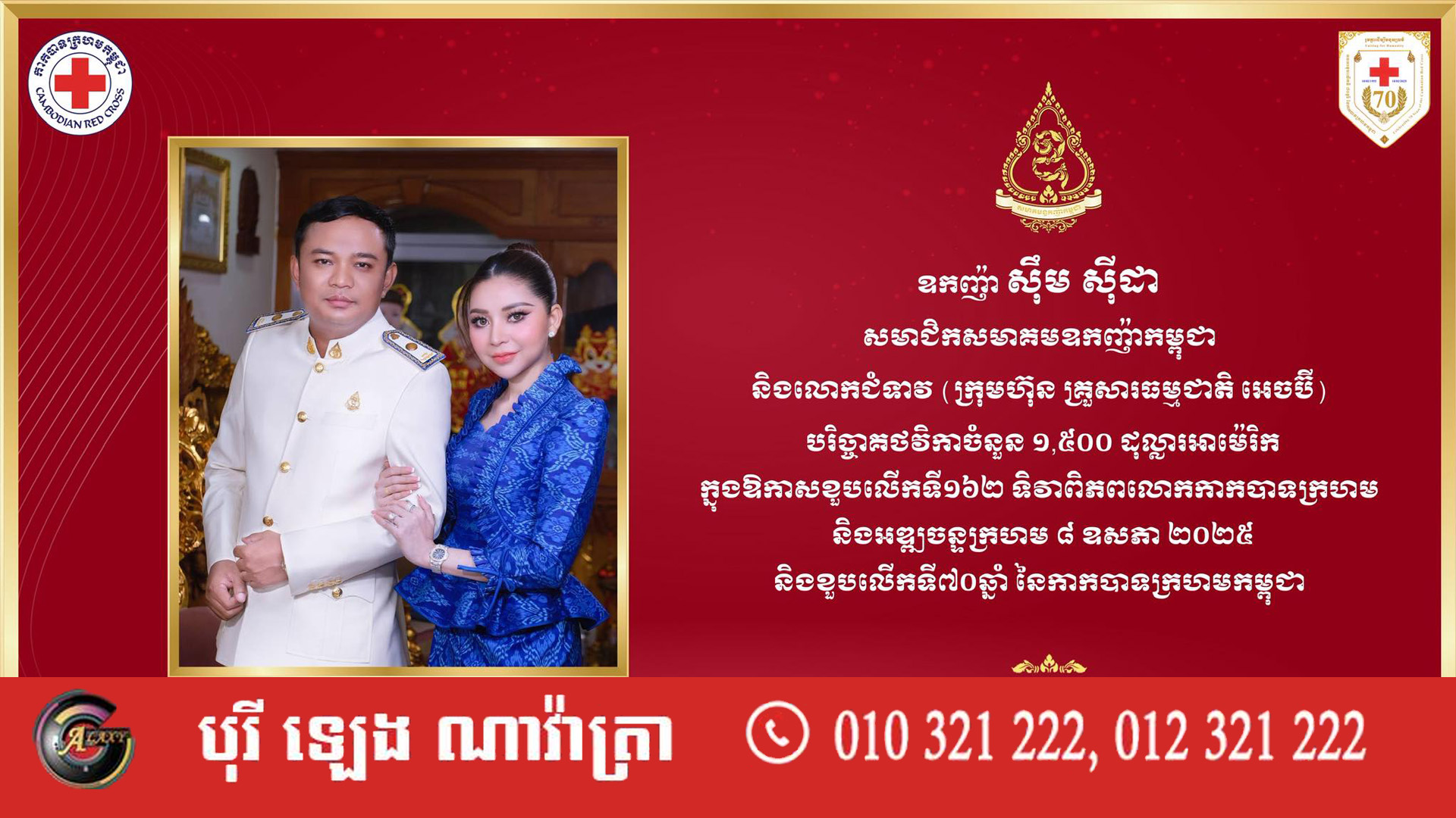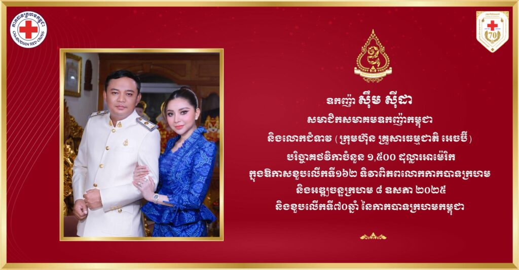 ឧកញ៉ា ស៊ឹម ស៊ីដា សមាជិកសមាគមឧកញ៉ាកម្ពុជា និងលោកជំទាវ (ក្រុមហ៊ុន គ្រួសារធម្មជាតិ អេចប៊ី) បរិច្ចាគថវិកាចំនួន ១,៥០០ ដុល្លារអាម៉េរិក ក្នុងឱកាសខួបលើកទី១៦២ ទិវាពិភពលោកកាកបាទក្រហម និងអឌ្ឍចន្ទក្រហម ៨ ឧសភា ឆ្នាំ២០២៥ និងខួបលើកទី៧០ឆ្នាំ នៃកាកបាទក្រហមកម្ពុជា។