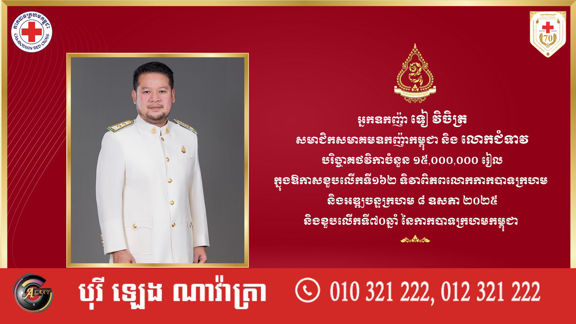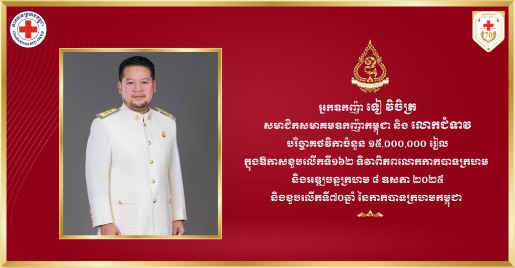 អ្នកឧកញ៉ា ទៀ វិចិត្រ សមាជិកសមាគមឧកញ៉ាកម្ពុជា និងលោកជំទាវ បរិច្ចាគថវិកាចំនួន ១៥,០០០,០០០ រៀល ក្នុងឱកាសខួបលើកទី១៦២ ទិវាពិភពលោកកាកបាទក្រហម និងអឌ្ឍចន្ទក្រហម ៨ ឧសភា ឆ្នាំ២០២៥ និងខួបលើកទី៧០ឆ្នាំ នៃកាកបាទក្រហមកម្ពុជា។