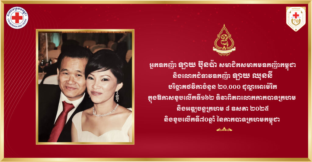 អ្នកឧកញ៉ា ឡាយ ប៊ុនប៉ា សមាជិកសមាគមឧកញ៉ាកម្ពុជា និងលោកជំទាវឧកញ៉ា ឡាយ ឈុននី បរិច្ចាគថវិកាចំនួន ២០,០០០ ដុល្លារអាម៉េរិក ក្នុងឱកាសខួបលើកទី១៦២ ទិវាពិភពលោកកាកបាទក្រហម និងអឌ្ឍចន្ទក្រហម ៨ ឧសភា ឆ្នាំ២០២៥ និងខួបលើកទី៧០ឆ្នាំ នៃកាកបាទក្រហមកម្ពុជា។
