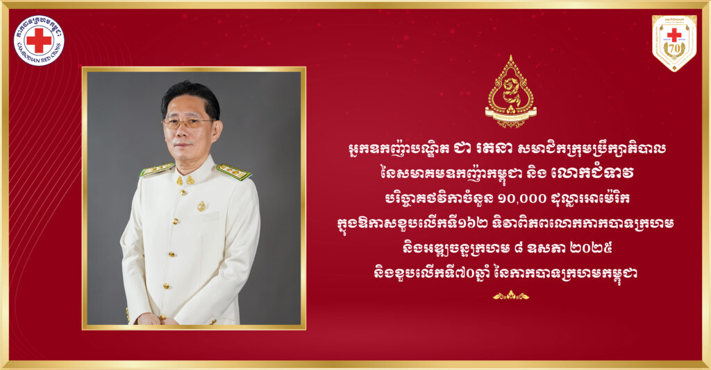 អ្នកឧកញ៉ាបណ្ឌិត ជា រតនា សមាជិកក្រុមប្រឹក្សាភិបាល នៃសមាគមឧកញ៉ាកម្ពុជា និងលោកជំទាវ បរិច្ចាគថវិកាចំនួន ១០,០០០ ដុល្លារអាម៉េរិក ក្នុងឱកាសខួបលើកទី១៦២ ទិវាពិភពលោកកាកបាទក្រហម និងអឌ្ឍចន្ទក្រហម ៨ ឧសភា ឆ្នាំ២០២៥ និងខួបលើកទី៧០ឆ្នាំ នៃកាកបាទក្រហមកម្ពុជា។