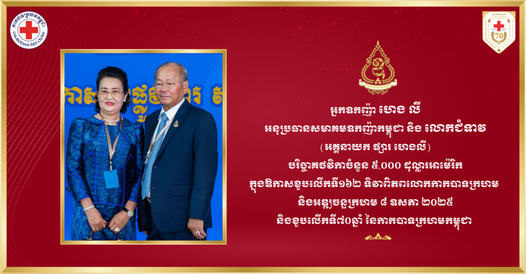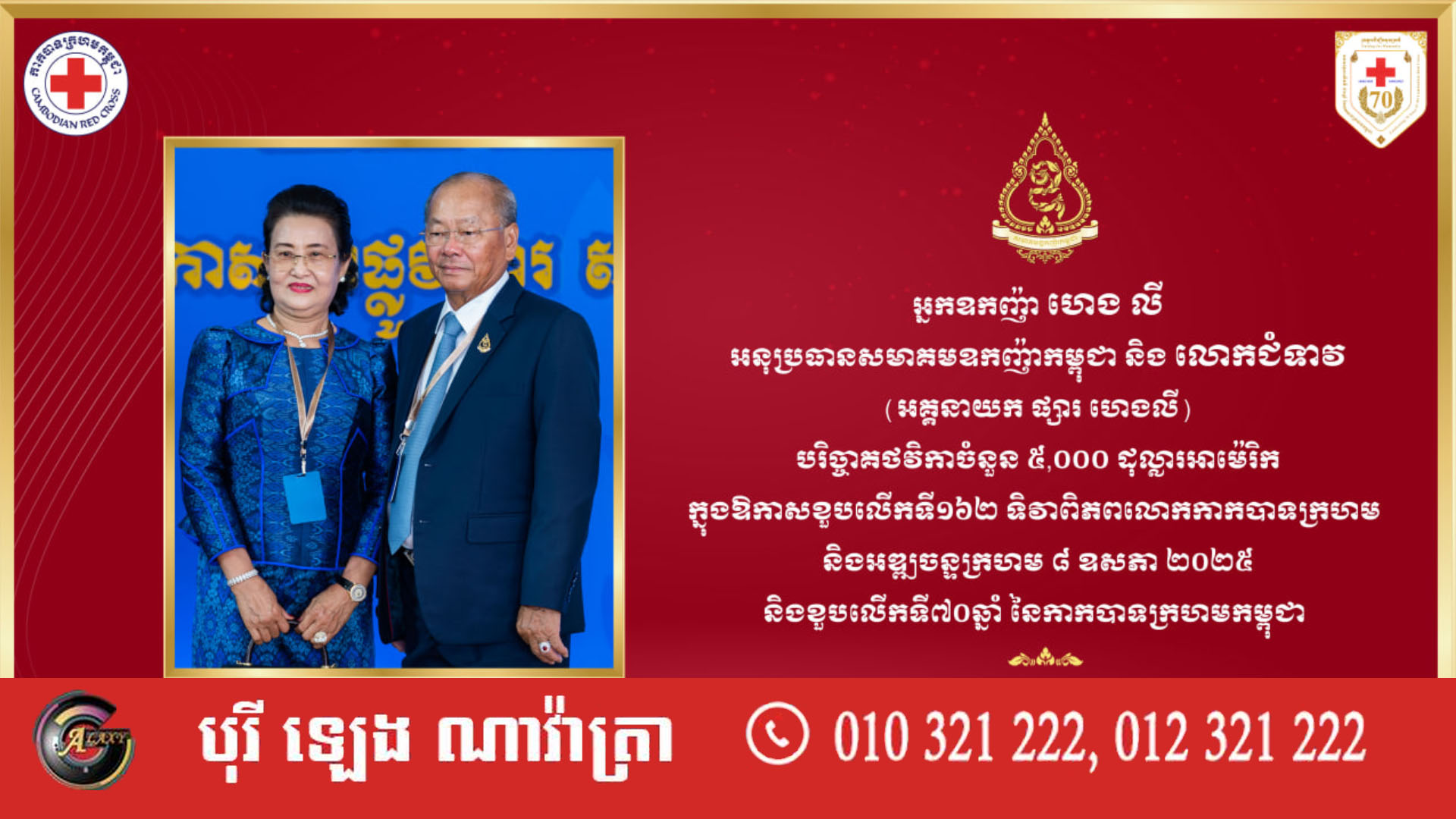 អ្នកឧកញ៉ា ហេង លី អនុប្រធានសមាគមឧកញ៉ាកម្ពុជា និងលោកជំទាវ (អគ្គនាយក ផ្សារ ហេងលី) បរិច្ចាគថវិកាចំនួន ៥,០០០ ដុល្លារអាម៉េរិក ក្នុងឱកាសខួបលើកទី១៦២ ទិវាពិភពលោកកាកបាទក្រហម និងអឌ្ឍចន្ទក្រហម ៨ ឧសភា ឆ្នាំ២០២៥ និងខួបលើកទី៧០ឆ្នាំ នៃកាកបាទក្រហមកម្ពុជា។