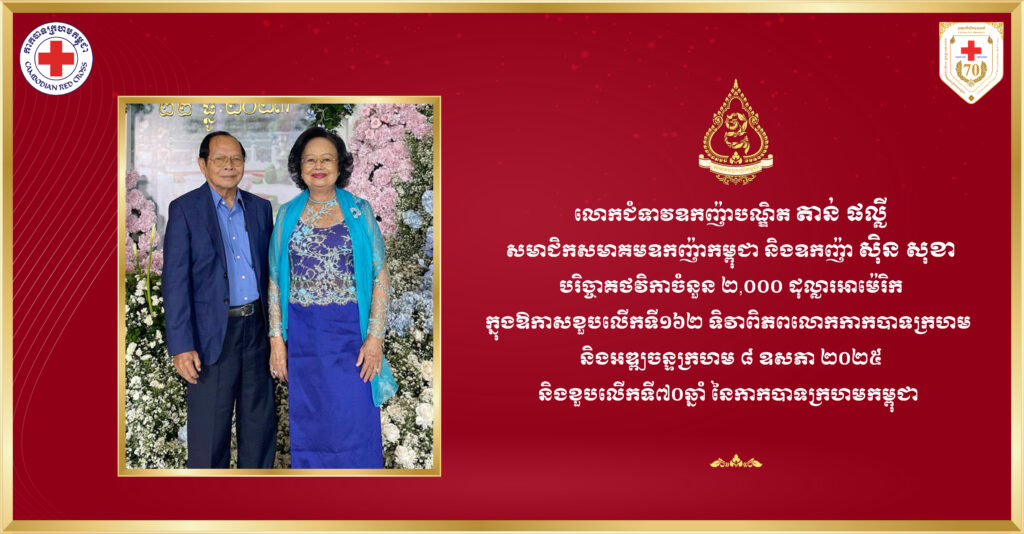 លោកជំទាវឧកញ៉ាបណ្ឌិត តាន់ ផល្លី សមាជិកសមាគមឧកញ៉ាកម្ពុជា និងឧកញ៉ា សុិន សុខា បរិច្ចាគថវិកាចំនួន ២,០០០ ដុល្លារអាម៉េរិក ក្នុងឱកាសខួបលើកទី១៦២ ទិវាពិភពលោកកាកបាទក្រហម និងអឌ្ឍចន្ទក្រហម ៨ ឧសភា ឆ្នាំ២០២៥ និងខួបលើកទី៧០ឆ្នាំ នៃកាកបាទក្រហមកម្ពុជា។