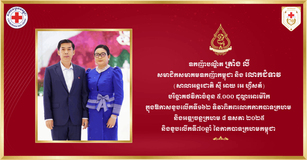 ឧកញ៉ាបណ្ឌិត ត្រាំង លី សមាជិកសមាគម ឧកញ៉ាកម្ពុជា និងលោកជំទាវ (សាលាអន្តរជាតិ ស៊ី អាយ អេ ហ្វឺសត៍) បរិច្ចាគថវិកាចំនួន ៥,០០០ ដុល្លារអាម៉េរិក ក្នុងឱកាសខួបលើកទី១៦២ ទិវាពិភពលោកកាកបាទក្រហម និងអឌ្ឍចន្ទក្រហម ៨ ឧសភា ឆ្នាំ២០២៥ និងខួបលើកទី៧០ឆ្នាំ នៃកាកបាទក្រហមកម្ពុជា។