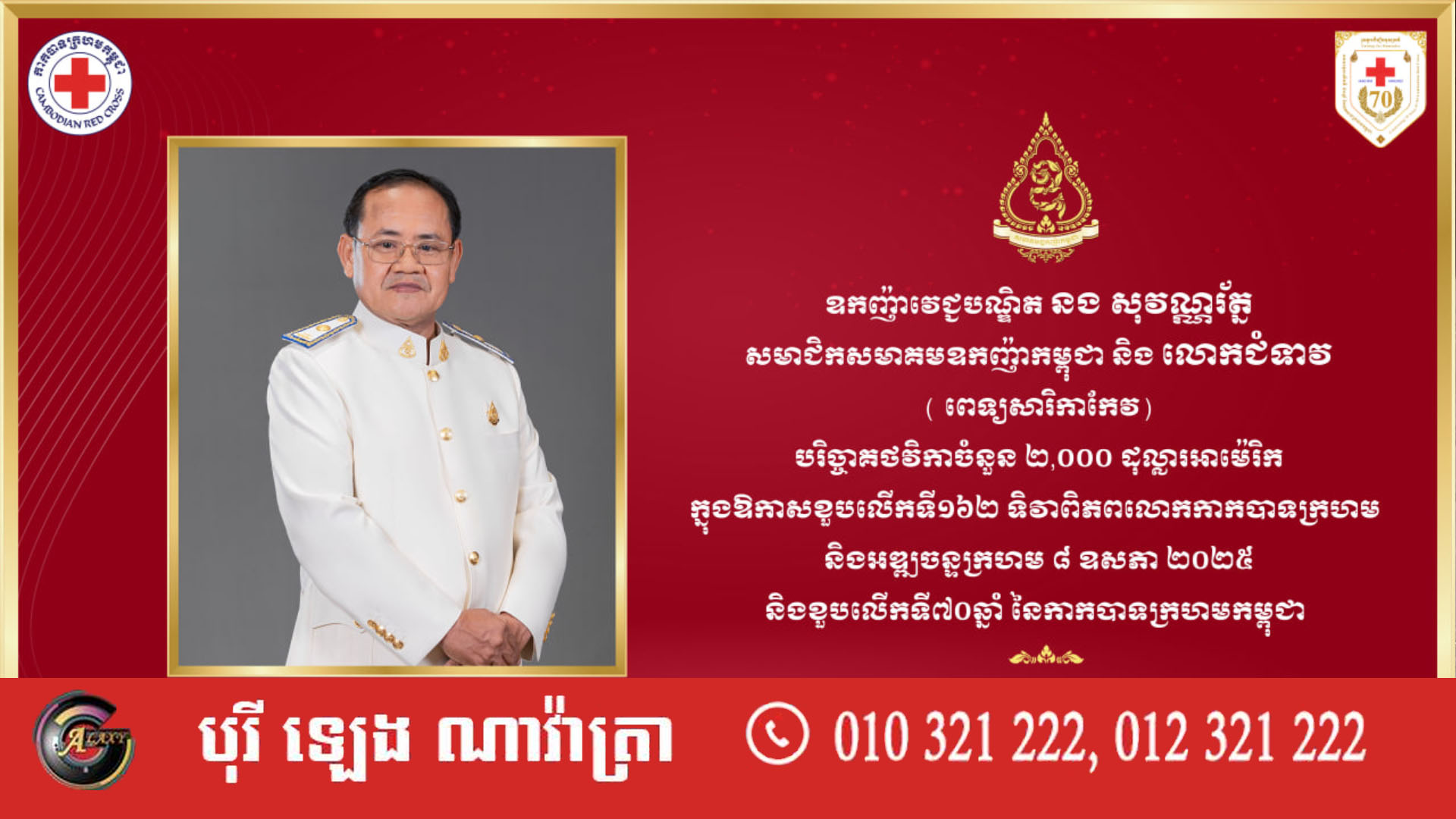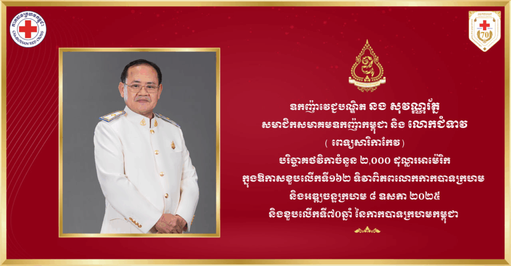 ឧកញ៉ាវេជ្ជបណ្ឌិត នង សុវណ្ណរ័ត្ន សមាជិកសមាគមឧកញ៉ាកម្ពុជា និងលោកជំទាវ ( ពេទ្យសារិកាកែវ) បរិច្ចាគថវិកាចំនួន ២,០០០ ដុល្លារអាម៉េរិក ក្នុងឱកាសខួបលើកទី១៦២ ទិវាពិភពលោកកាកបាទក្រហម និងអឌ្ឍចន្ទក្រហម ៨ ឧសភា ឆ្នាំ២០២៥ និងខួបលើកទី៧០ឆ្នាំ នៃកាកបាទក្រហមកម្ពុជា។