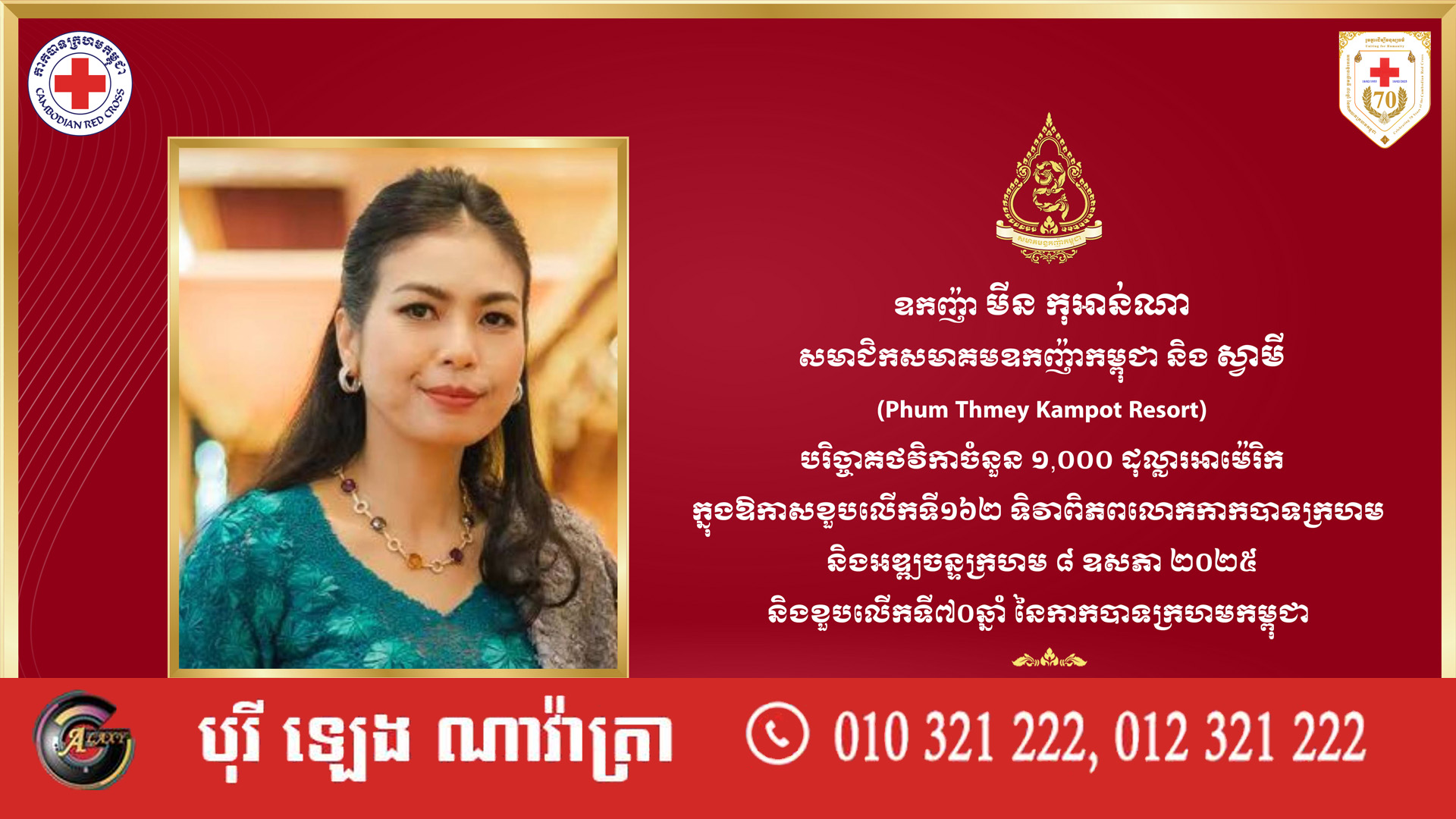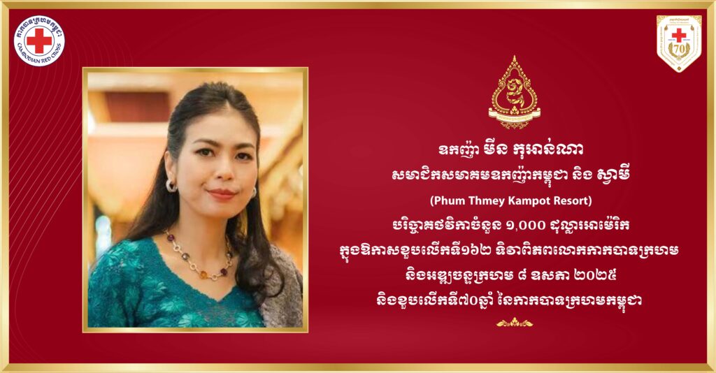 ឧកញ៉ា មីន កុអាន់ណា សមាជិកសមាគមឧកញ៉ាកម្ពុជា និងស្វាមី (Phum Thmey Kampot Resort) បរិច្ចាគថវិកាចំនួន ១,០០០ ដុល្លារអាម៉េរិក ក្នុងឱកាសខួបលើកទី១៦២ ទិវាពិភពលោកកាកបាទក្រហម និងអឌ្ឍចន្ទក្រហម ៨ ឧសភា ឆ្នាំ២០២៥ និងខួបលើកទី៧០ឆ្នាំ នៃកាកបាទក្រហមកម្ពុជា។