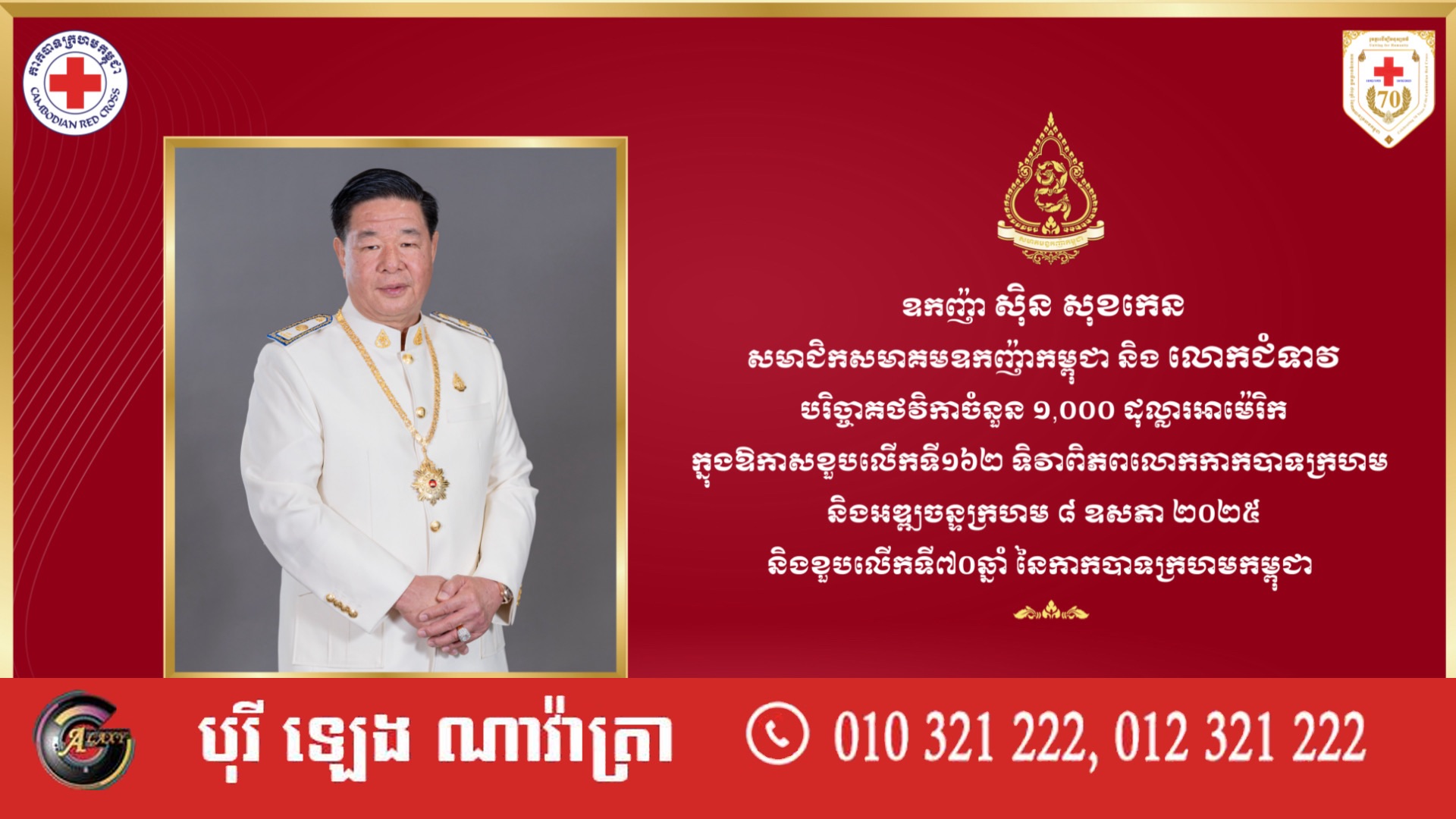 ឧកញ៉ា សុិន សុខកេន សមាជិកសមាគមឧកញ៉ាកម្ពុជា និងលោកជំទាវ បរិច្ចាគថវិកាចំនួន ១,០០០ ដុល្លារអាម៉េរិក ក្នុងឱកាសខួបលើកទី១៦២ ទិវាពិភពលោកកាកបាទក្រហម និងអឌ្ឍចន្ទក្រហម ៨ ឧសភា ឆ្នាំ២០២៥ និងខួបលើកទី៧០ឆ្នាំ នៃកាកបាទក្រហមកម្ពុជា។