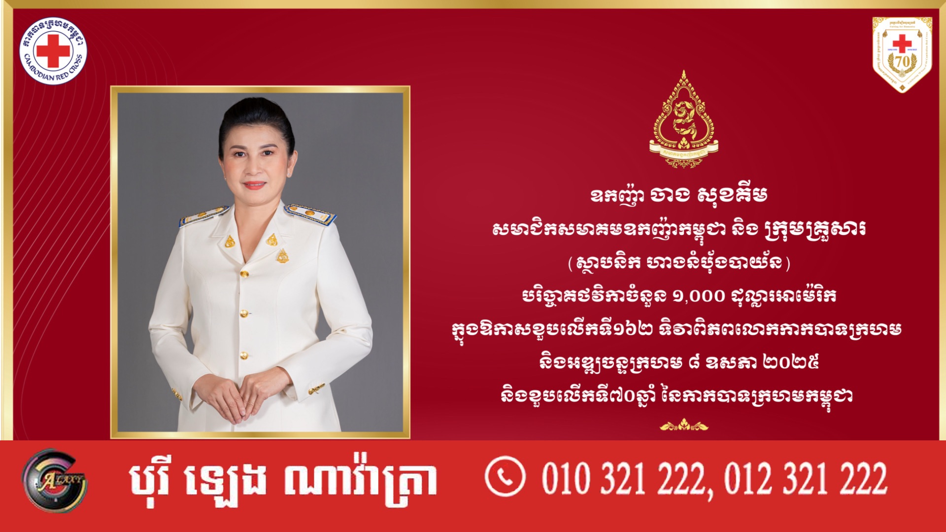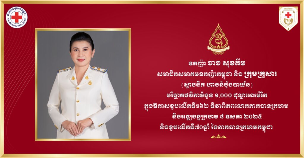 ឧកញ៉ា ចាង សុខគីម សមាជិកសមាគមឧកញ៉ាកម្ពុជា និងក្រុមគ្រួសារ បរិច្ចាគថវិកាចំនួន ១,០០០ ដុល្លារអាម៉េរិក ក្នុងឱកាសខួបលើកទី១៦២ ទិវាពិភពលោកកាកបាទក្រហម និងអឌ្ឍចន្ទក្រហម ៨ ឧសភា ឆ្នាំ២០២៥ និងខួបលើកទី៧០ឆ្នាំ នៃកាកបាទក្រហមកម្ពុជា។