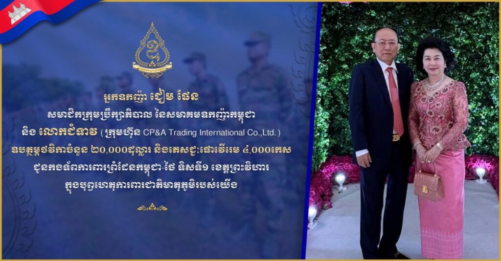 អ្នកឧកញ៉ា ជៀម ផែន សមាជិកក្រុមប្រឹក្សាភិបាល នៃសមាគមឧកញ៉ាកម្ពុជា និងលោកជំទាវ (ក្រុមហ៊ុន CP&A Trading International Co., Ltd.) ប្រកាសឧបត្ថម្ភថវិកាចំនួន ២០,០០០ដុល្លារ និងភេសជ្ជៈផោវើរេម ៤,០០០កេស ជូនកងទ័ពការពារព្រំដែនកម្ពុជា-ថៃ ទិសទី១ ខេត្តព្រះវិហារក្នុងបុព្វហេតុការពារជាតិមាតុភូមិរបស់កម្ពុជា តបតាមការអំពាវនាវរបស់ សម្តេចតេជោ ហ៊ុន សែន ប្រធានព្រឹទ្ធសភា។ នេះបើតាមសមាគមឧកញ៉ាកម្ពុជា បានបង្ហើបឱ្យដឹង នៅរសៀលថ្ងៃទី០៣ ខែមិថុនានេះ។