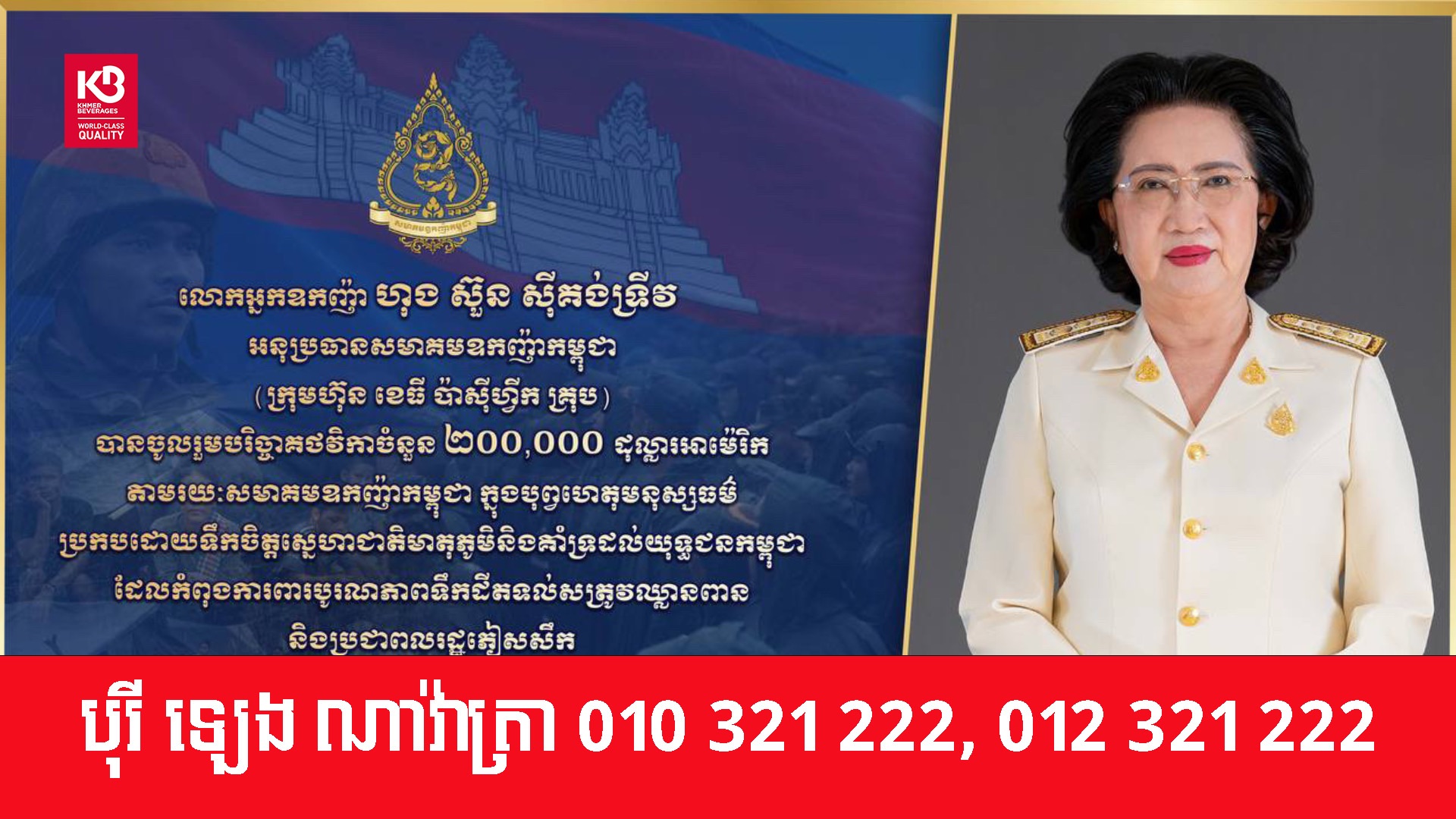 ការចូលរួមឧបត្ថម្ភថវិការបស់ លោកអ្នកឧកញ៉ា គឺជាការចូលរួមចំណែកលើកទឹកចិត្តដល់កងទ័ពកម្ពុជាដ៏អង់អាចក្លាហានរបស់កម្ពុជា ដែលកំពុងឈរជើងជាប់ជាប្រចាំដើម្បីការពារបូរណភាពទឹកដី នៅតាមបណ្តោយព្រំដែនកម្ពុជា-ថៃ។