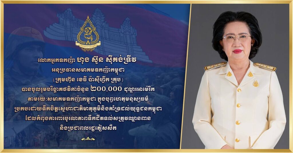 លោកអ្នកឧកញ៉ា ហុង ស៊ួន សុីគង់ទ្រីវ អនុប្រធានសមាគមឧកញ៉ាកម្ពុជា (ក្រុមហ៊ុន ខេធី ប៉ាសុីហ្វិក គ្រុប) បានចូលរួមបរិច្ចាគថវិកាចំនួន ២០០,០០០ ដុល្លារអាម៉េរិក តាមរយៈសមាគមឧកញ៉ាកម្ពុជា ក្នុងបុព្វហេតុមនុស្សធម៌ ប្រកបដោយទឹកចិត្តស្នេហាជាតិមាតុភូមិ និងគាំទ្រដល់យុទ្ធជនកម្ពុជាដែលកំពុងការពារបូរណភាពទឹកដីតទល់សត្រូវឈ្លានពាន និងប្រជាពលរដ្ឋភៀសសឹក។